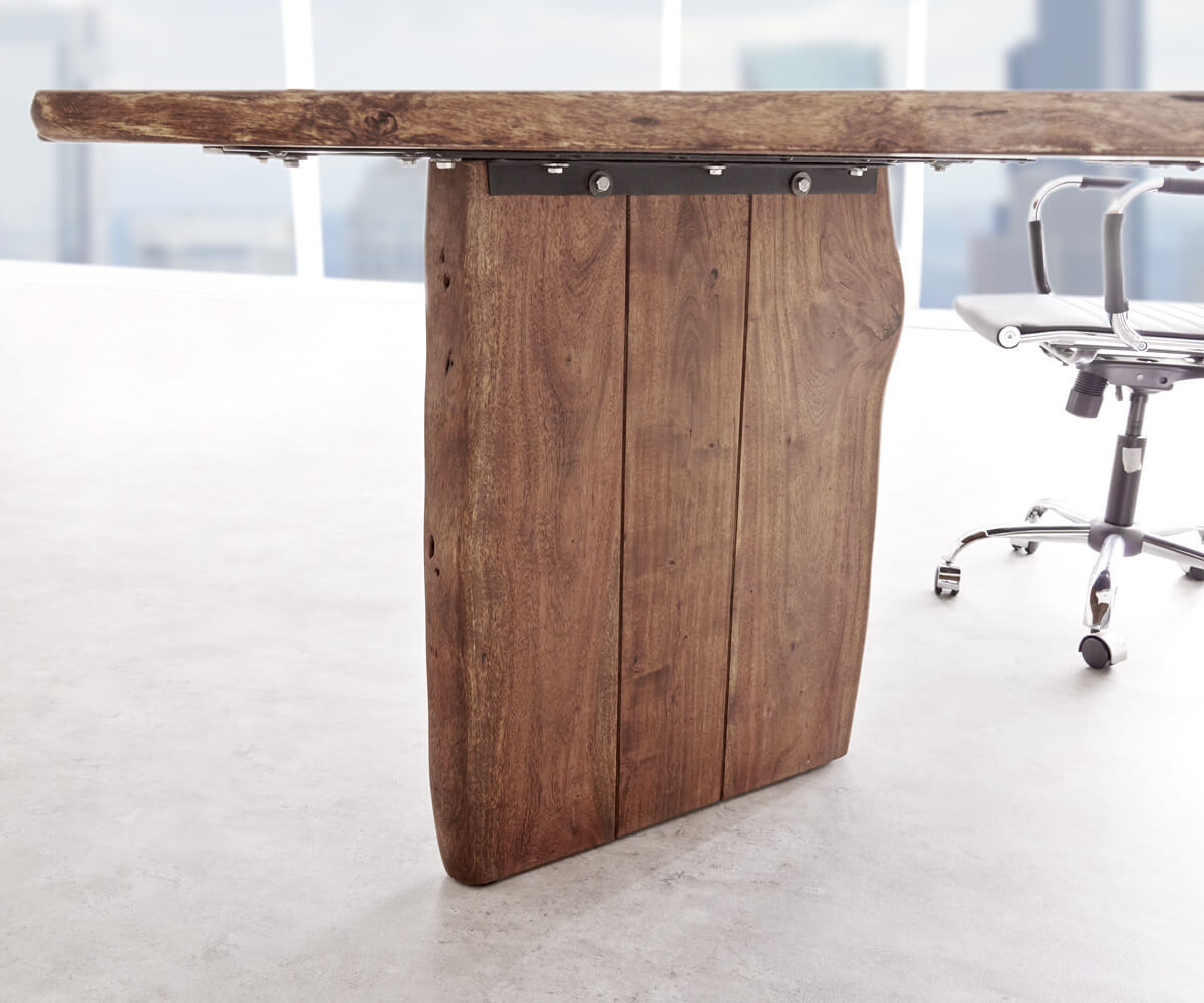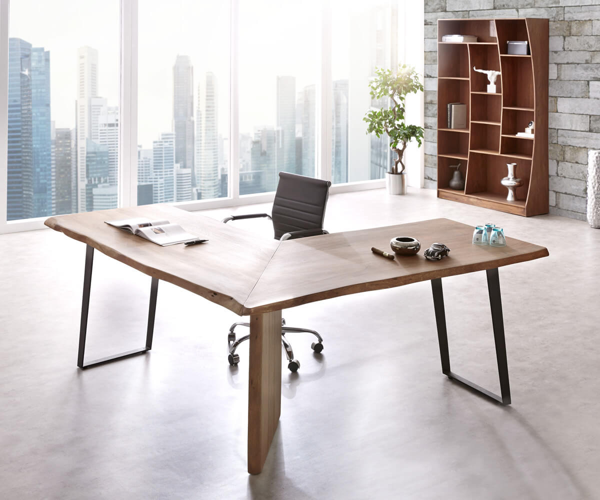 Se stolem Live-Edge můžete obohatit svou domácí pracovnu o mimořádně praktickou pozornost. Rohový psací stůl získává svou vizuální přitažlivost díky dvěma stolním deskám. Jsou vyrobeny z masivního akátu, prezentují se povrchem v matně hnědé barvě a vykazují tak jedinečně živou kresbu . Zvláštností desek, které se opírají o dva černé ocelové podběhy a dřevěnou lícnici, je však individuální hrana ve tvaru stromu.