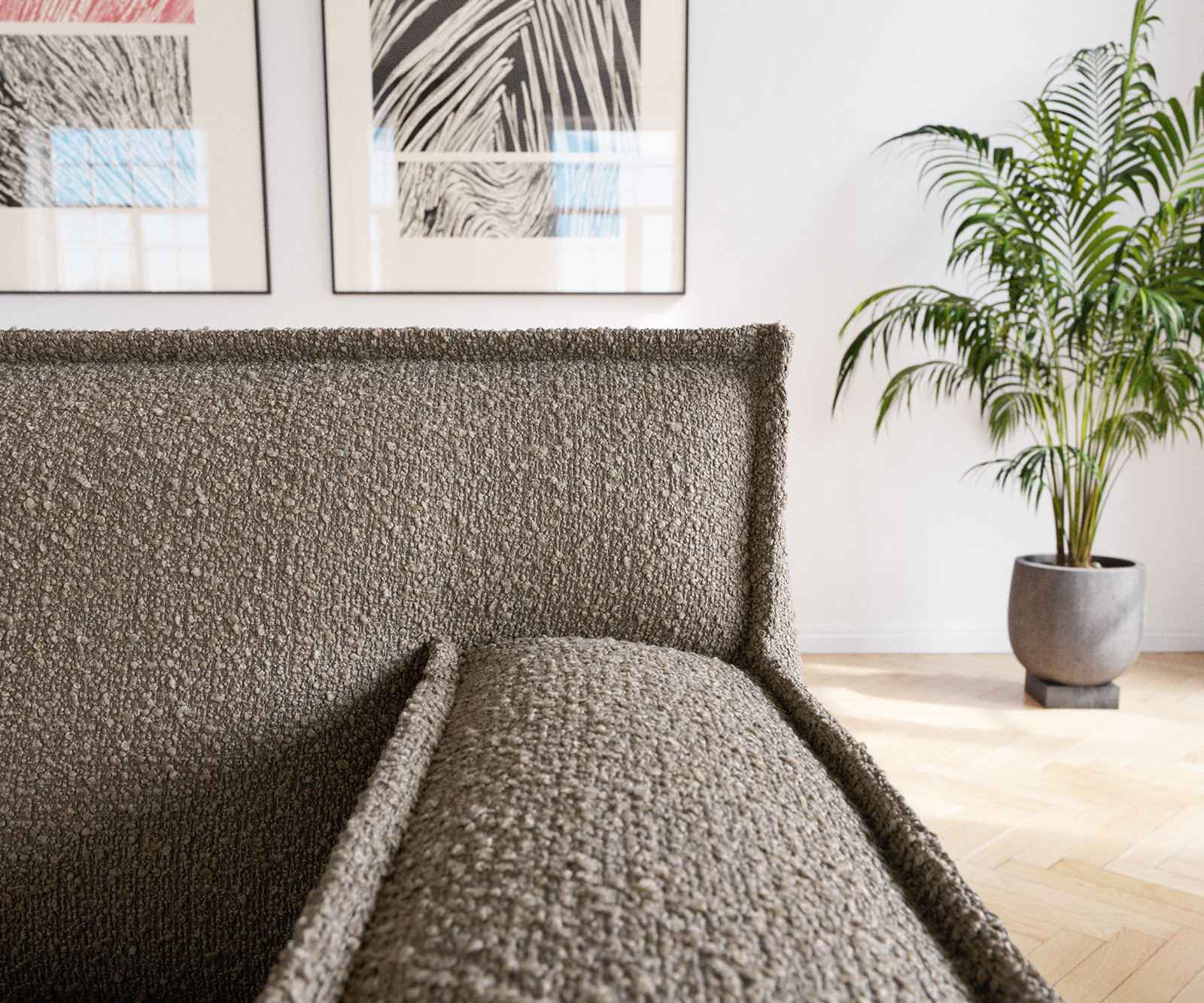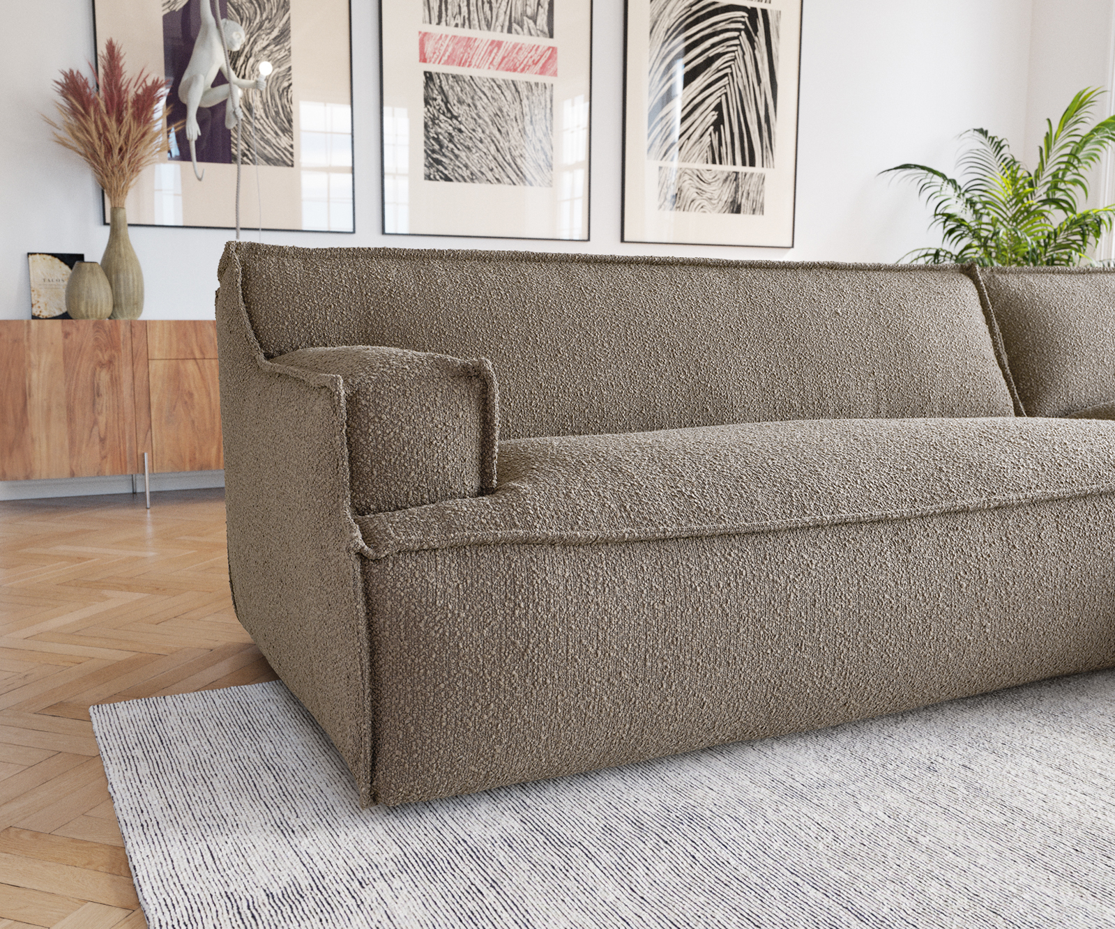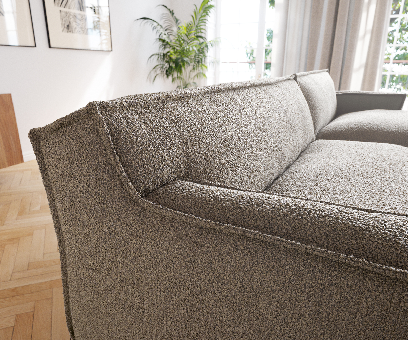 Pohovka s potahem bouclé působí velmi zvláštním dojmem díky okouzlujícímu klidnému zbarvení do bahna a nápadnému lemování – úzkému prošívanému záhybu na okrajích. Provedení obepínající podlahu působí útulně a v současné době je velmi oblíbené. Tento model působí obzvlášť efektně v módním stylu Scandi nebo v moderní loftové atmosféře a stane se středobodem místnosti.