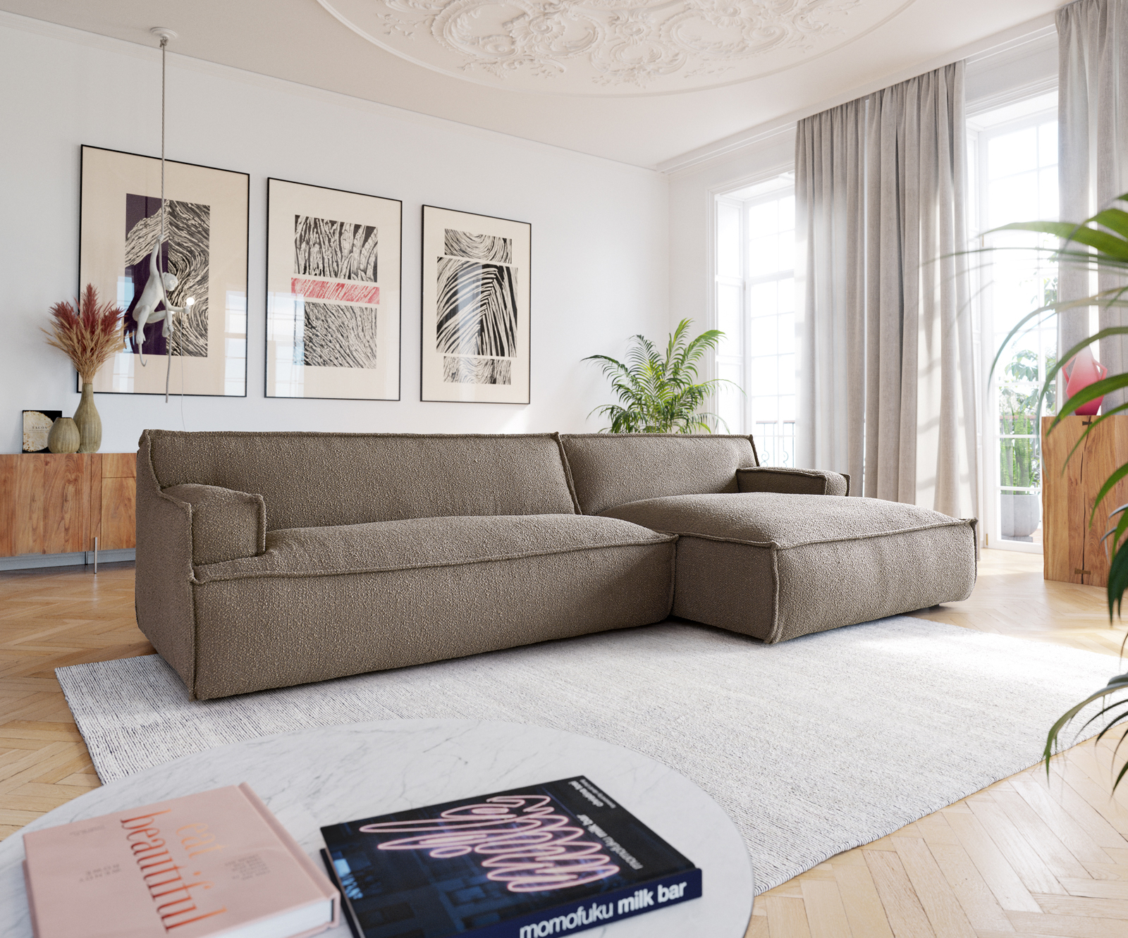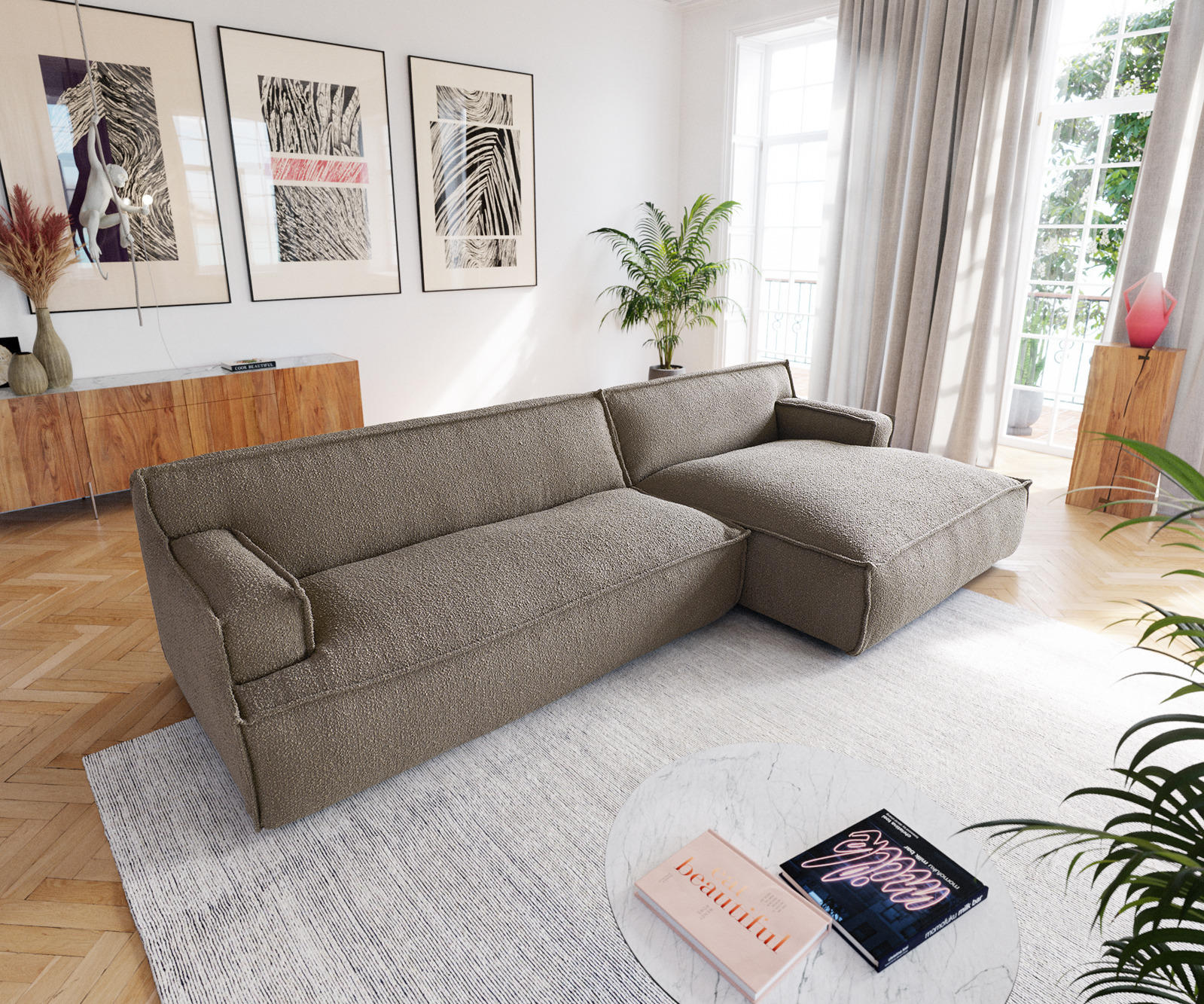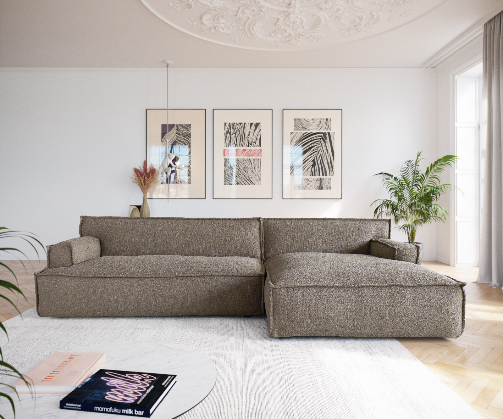 Pohovka s potahem bouclé působí velmi zvláštním dojmem díky okouzlujícímu klidnému zbarvení do bahna a nápadnému lemování – úzkému prošívanému záhybu na okrajích. Provedení obepínající podlahu působí útulně a v současné době je velmi oblíbené. Tento model působí obzvlášť efektně v módním stylu Scandi nebo v moderní loftové atmosféře a stane se středobodem místnosti.