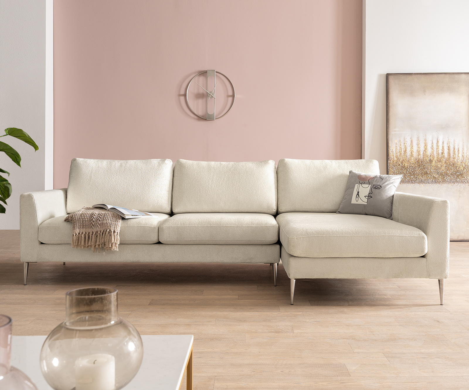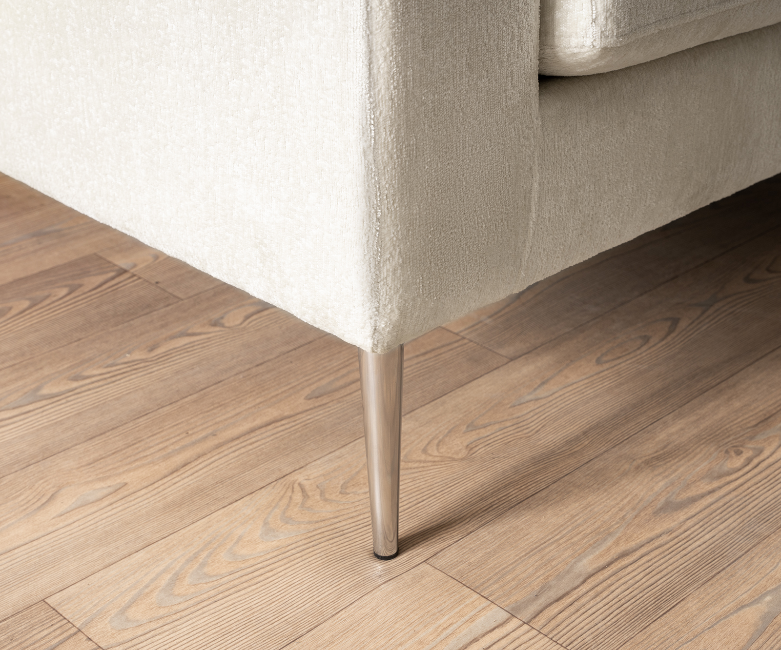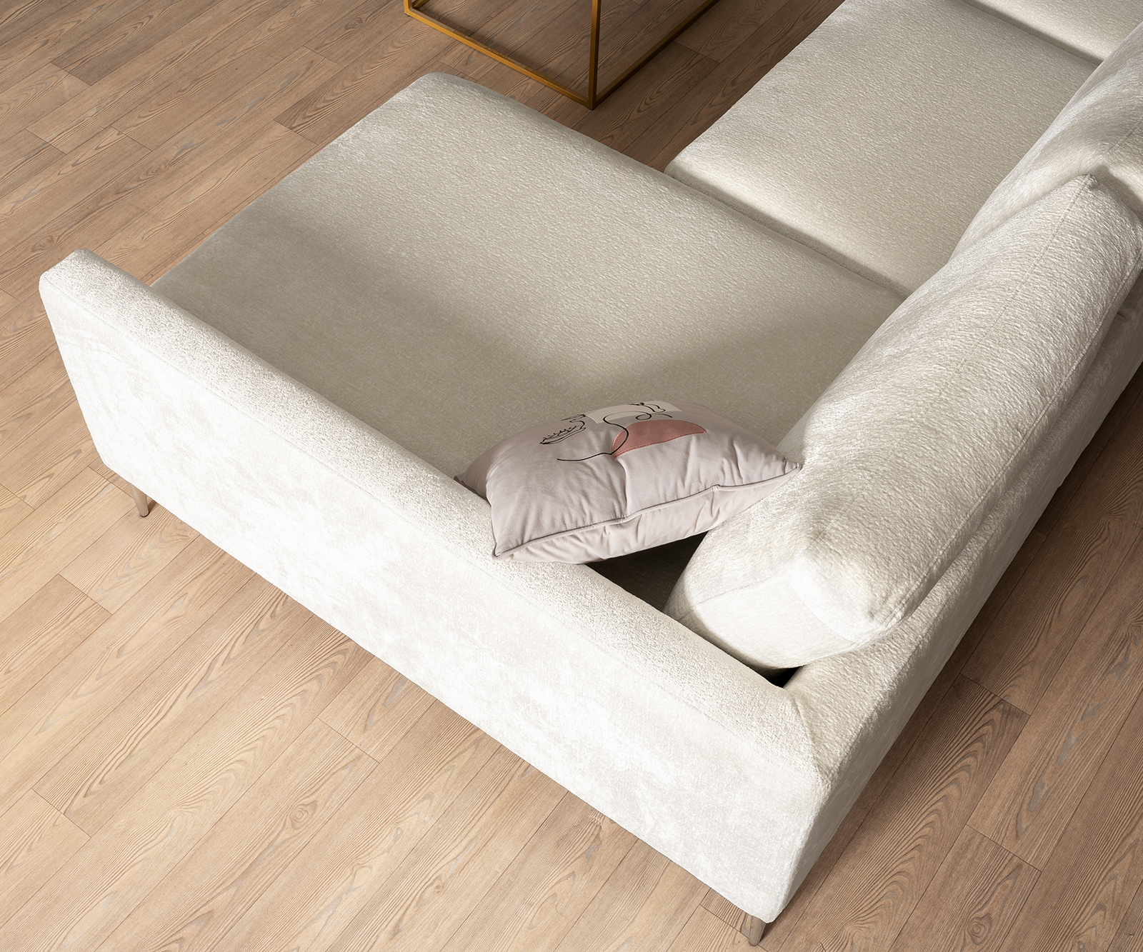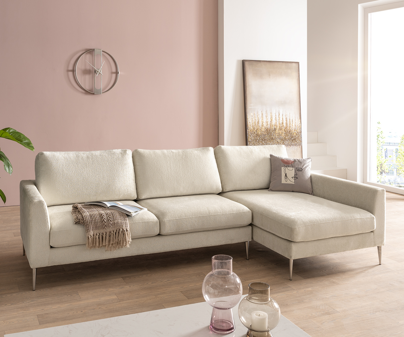 Rohová sedací souprava Marla působí díky svému štíhlému tvaru bez podlahy mimořádně moderně a stylově. Tento dojem podtrhují dlouhé úzké nožky z matného lesklého kovu v nadčasové stříbrné barvě, kterými je čalouněná rohová sedací souprava vybavena. S tím koresponduje i atraktivní barva útulného potahu ze sametové žinylkové látky. Nádherná krémově bílá barva dodává pohovce do tvaru L nádherný bezstarostný nádech.