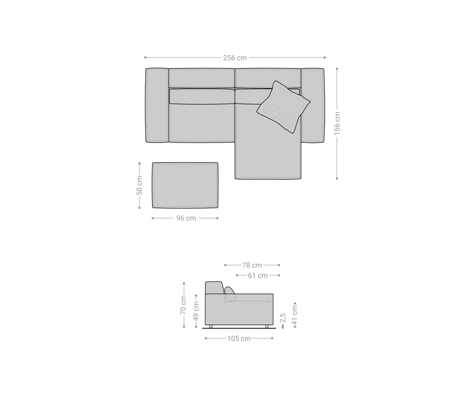 - Přibližné rozměry: Š256 x D156 x V70 cm