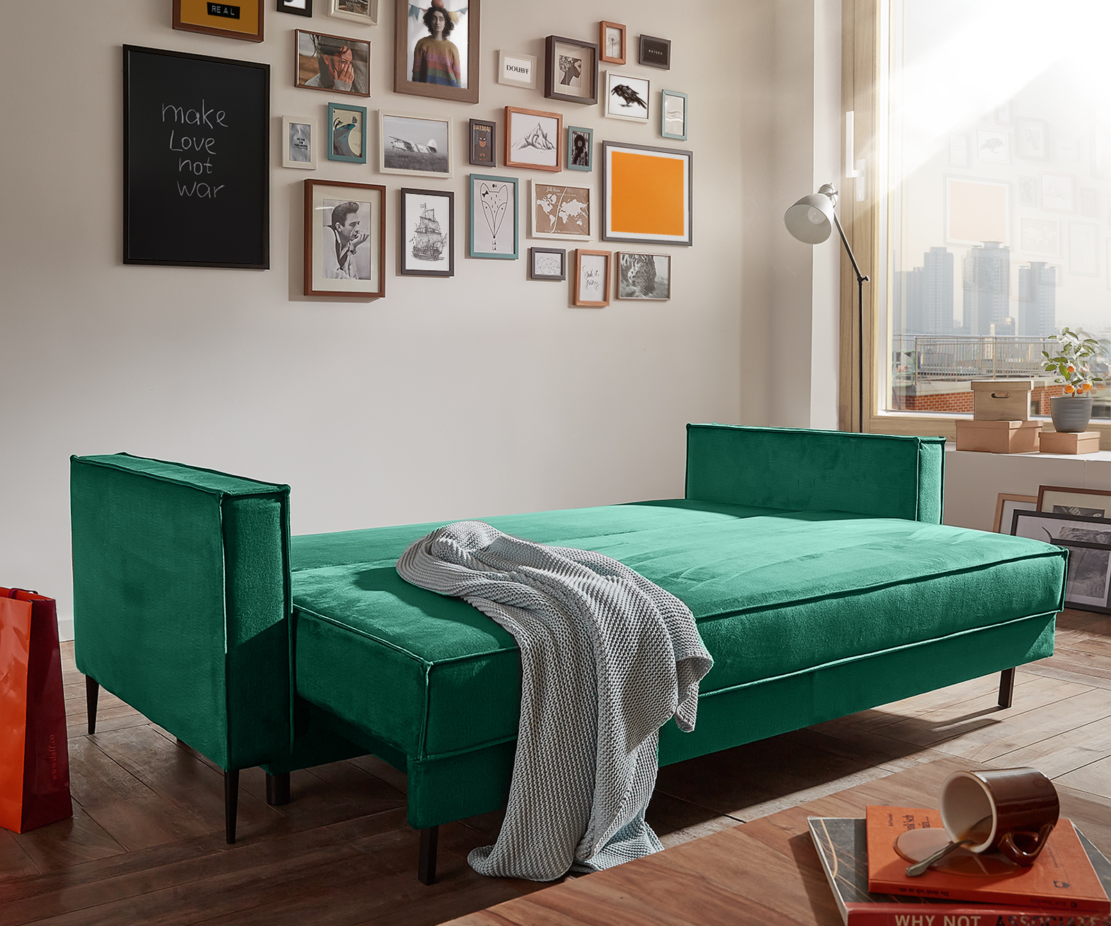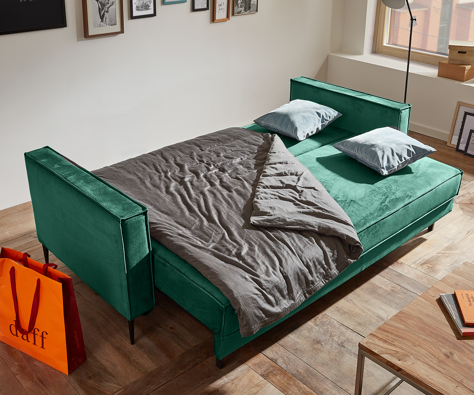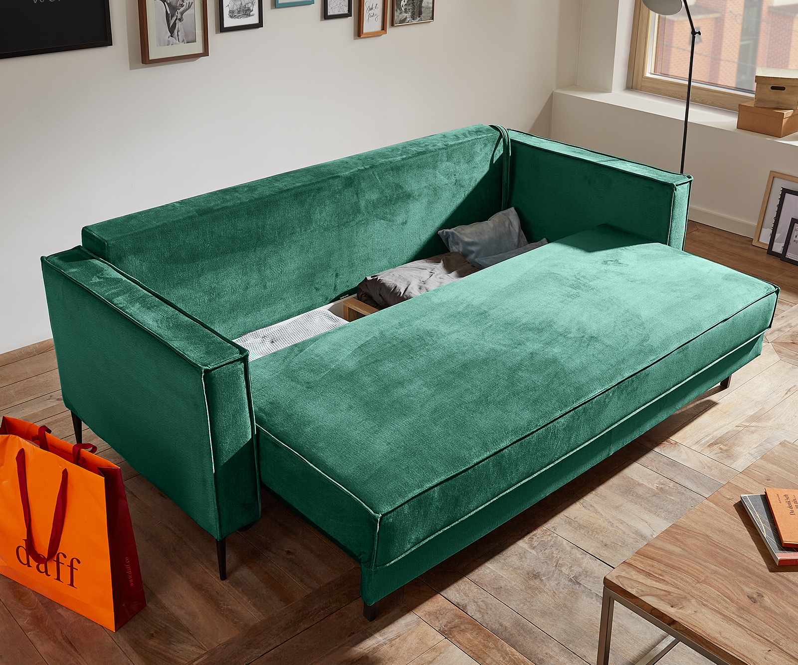 Vizuálně rozkládací pohovka zaujme filigránskými kovovými nožičkami, které vytvářejí bezstarostný vzhled bez podlahy. Vaše barevné provedení v černé barvě stylově kontrastuje se zelenou barvou potahu. Design rozkládací pohovky dotvářejí speciální detaily švů. Vestavěná funkce automatického zvedání vám usnadní její přeměnu ze sedačky na lůžko. Prostorný základ postele nabízí dostatek místa pro ložní prádlo, přikrývky a polštáře.