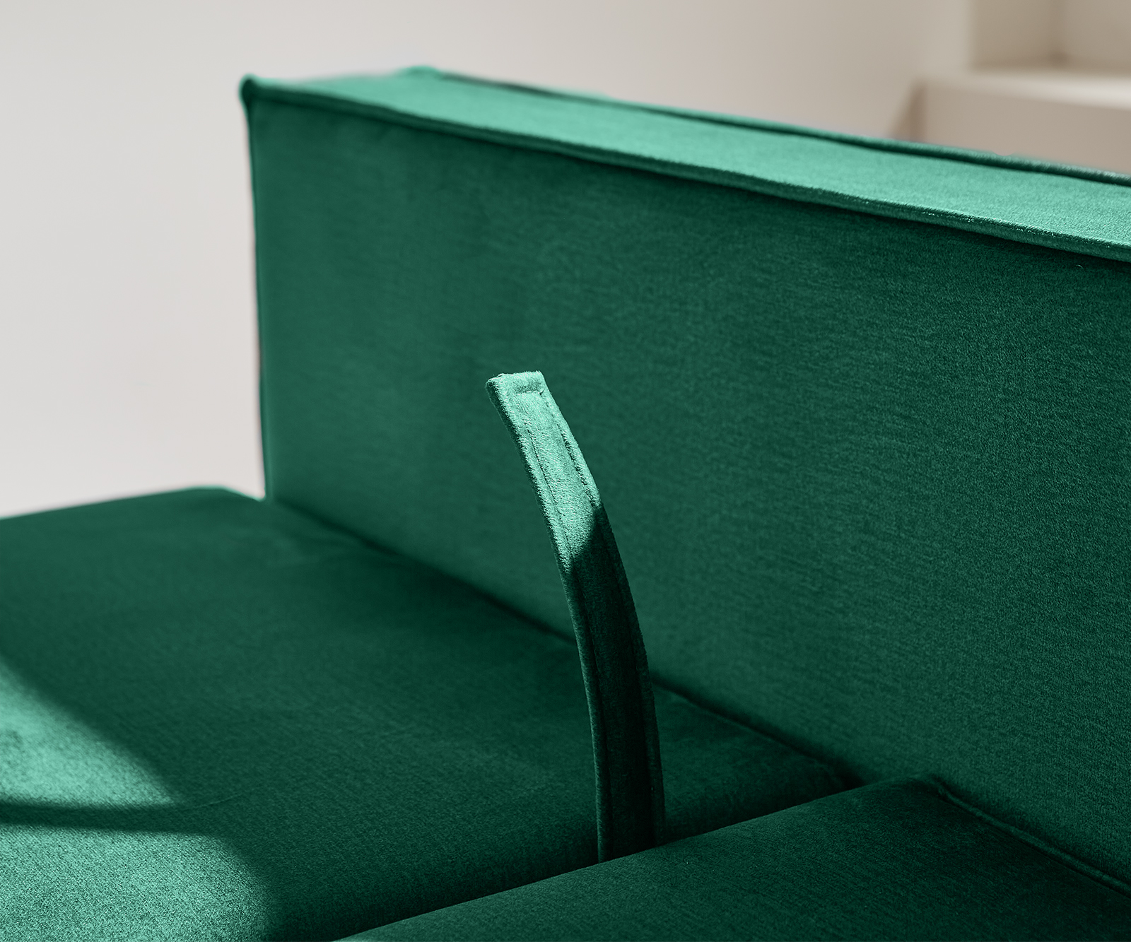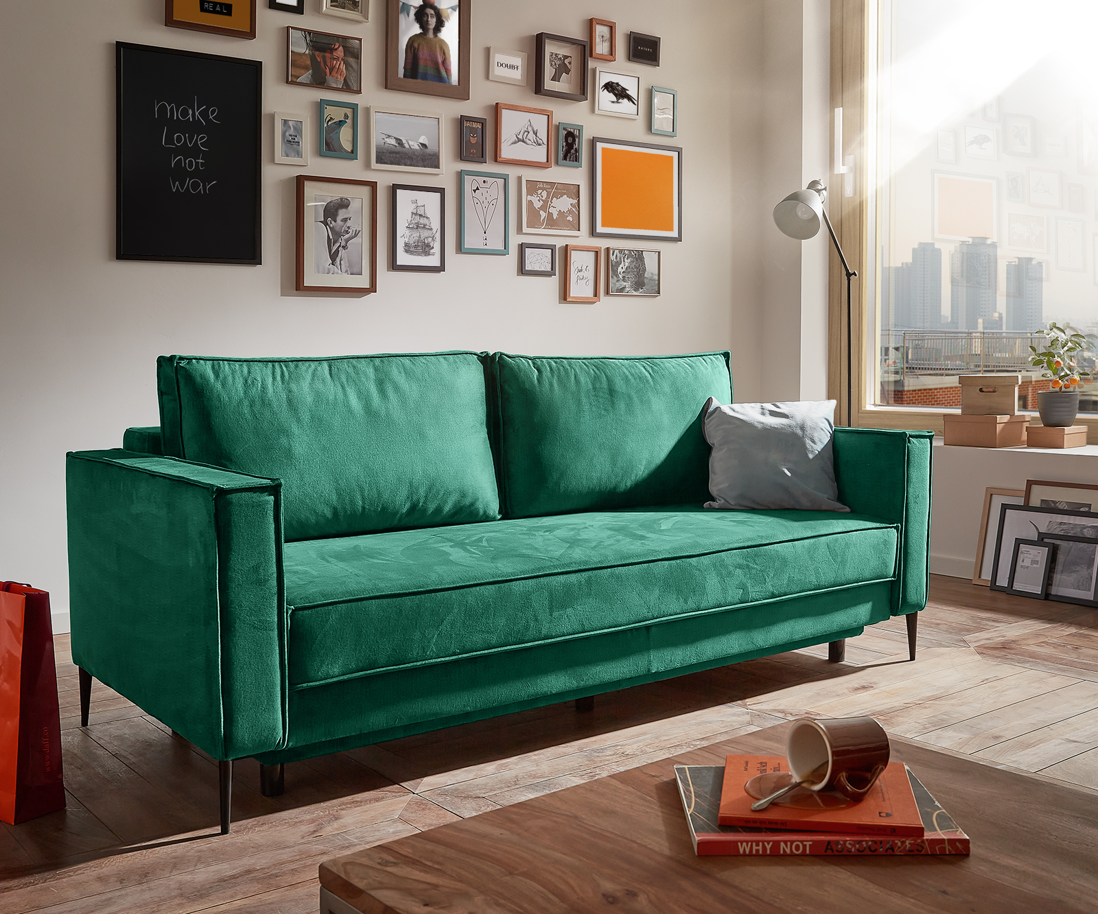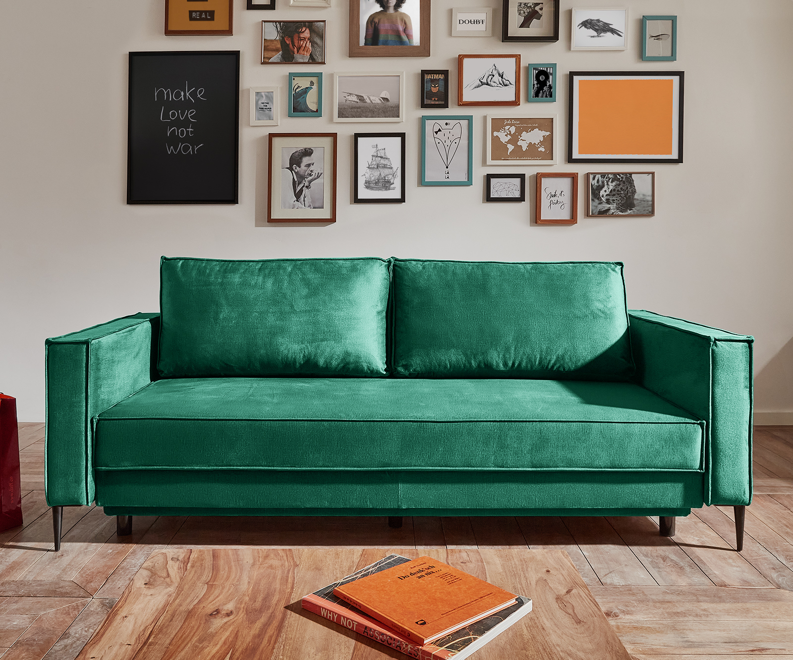 Vizuálně rozkládací pohovka zaujme filigránskými kovovými nožičkami, které vytvářejí bezstarostný vzhled bez podlahy. Vaše barevné provedení v černé barvě stylově kontrastuje se zelenou barvou potahu. Design rozkládací pohovky dotvářejí speciální detaily švů. Vestavěná funkce automatického zvedání vám usnadní její přeměnu ze sedačky na lůžko. Prostorný základ postele nabízí dostatek místa pro ložní prádlo, přikrývky a polštáře.