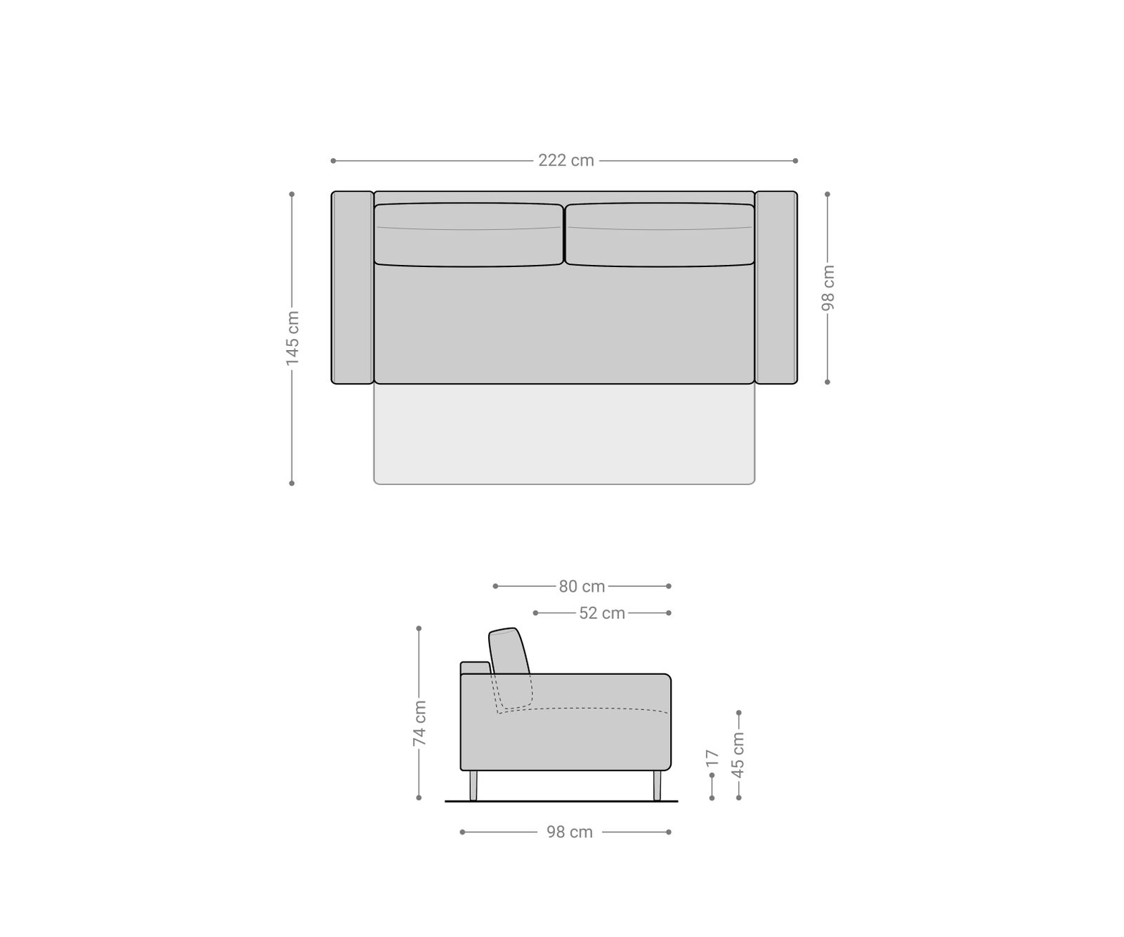 - Přibližné rozměry: Š222 x D98 x V74 cm