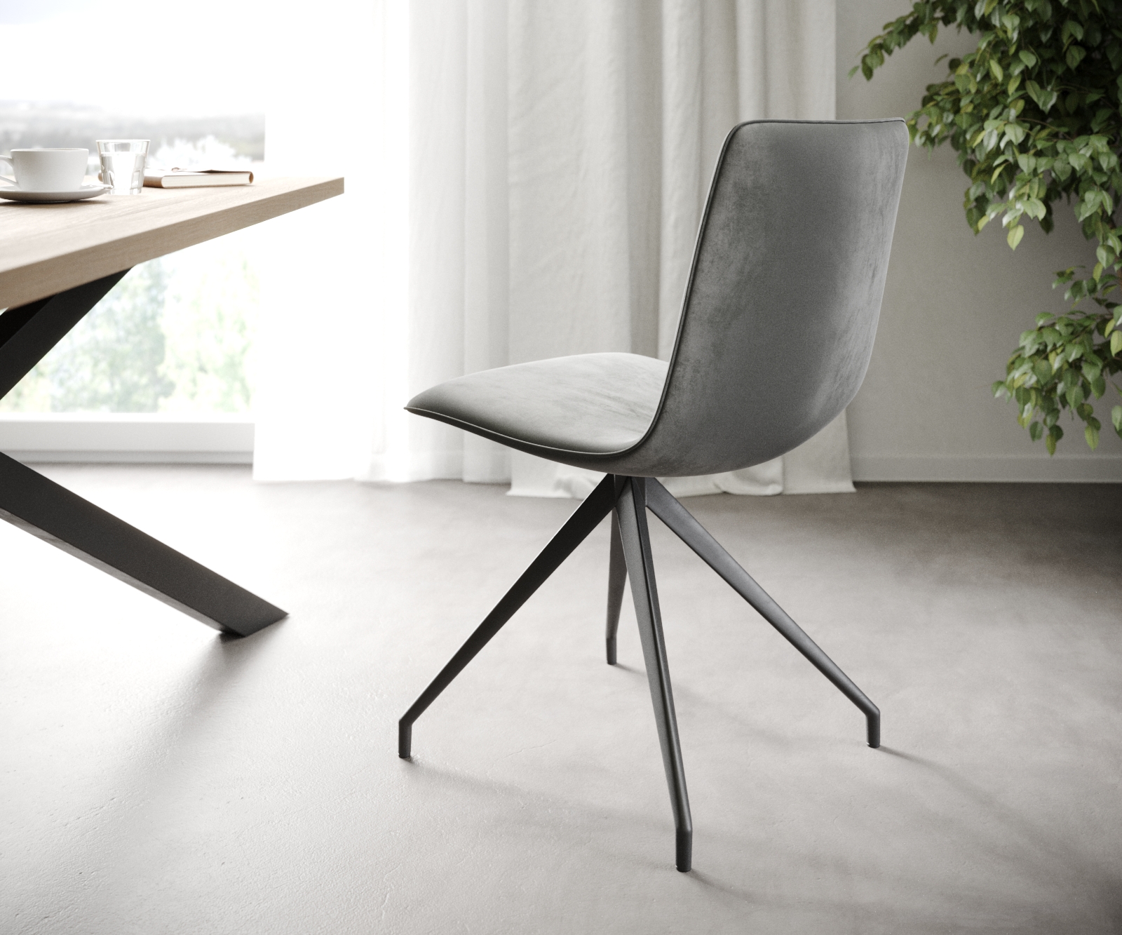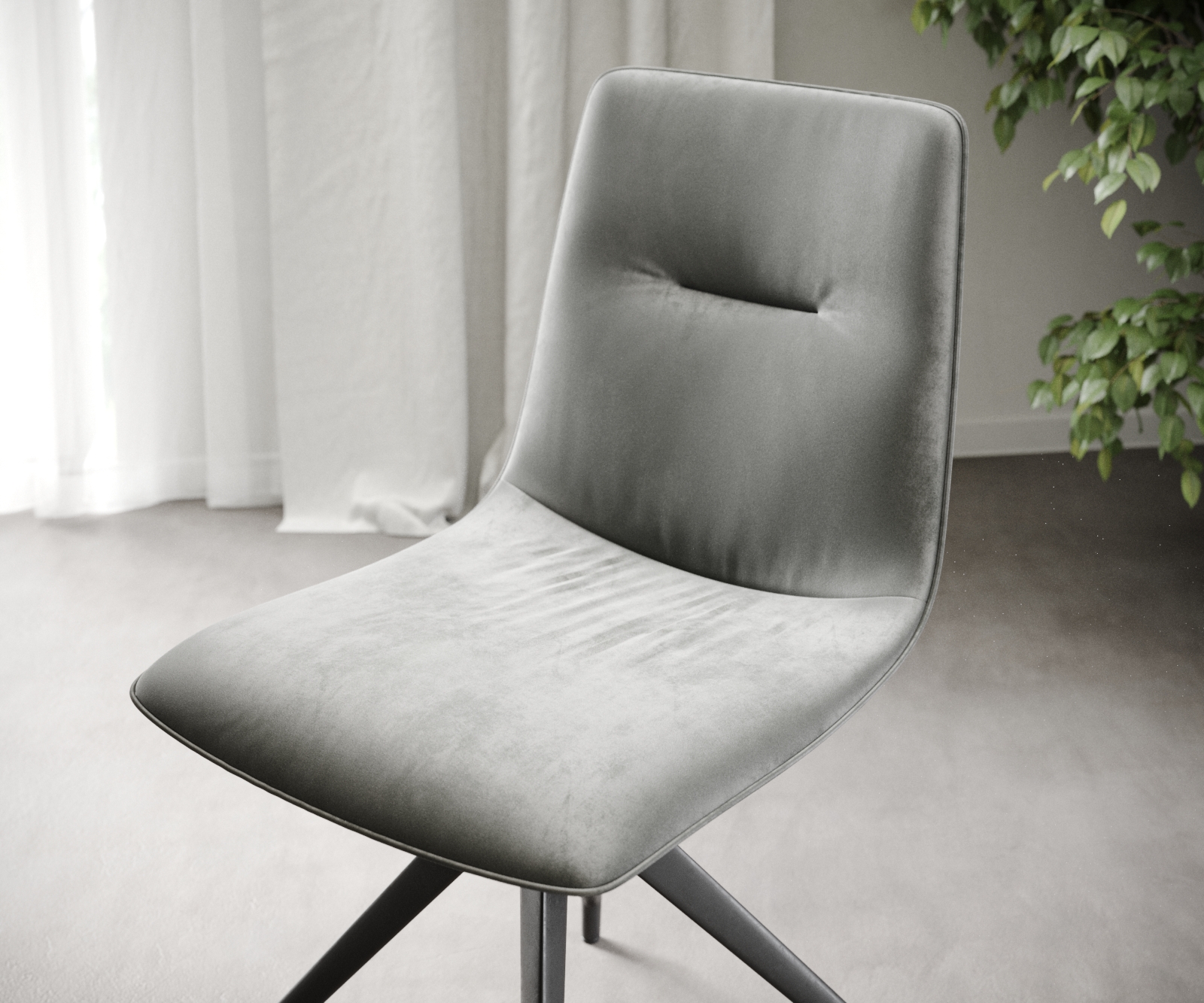 Skořepiny sedáků židlí jsou potaženy moderní sametovou látkou, která nastavuje třpytivé akcenty v jemném šedém tónu. Látka je mimořádně měkká a příjemná na dotek.