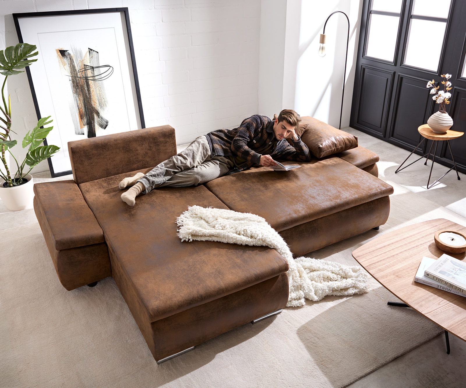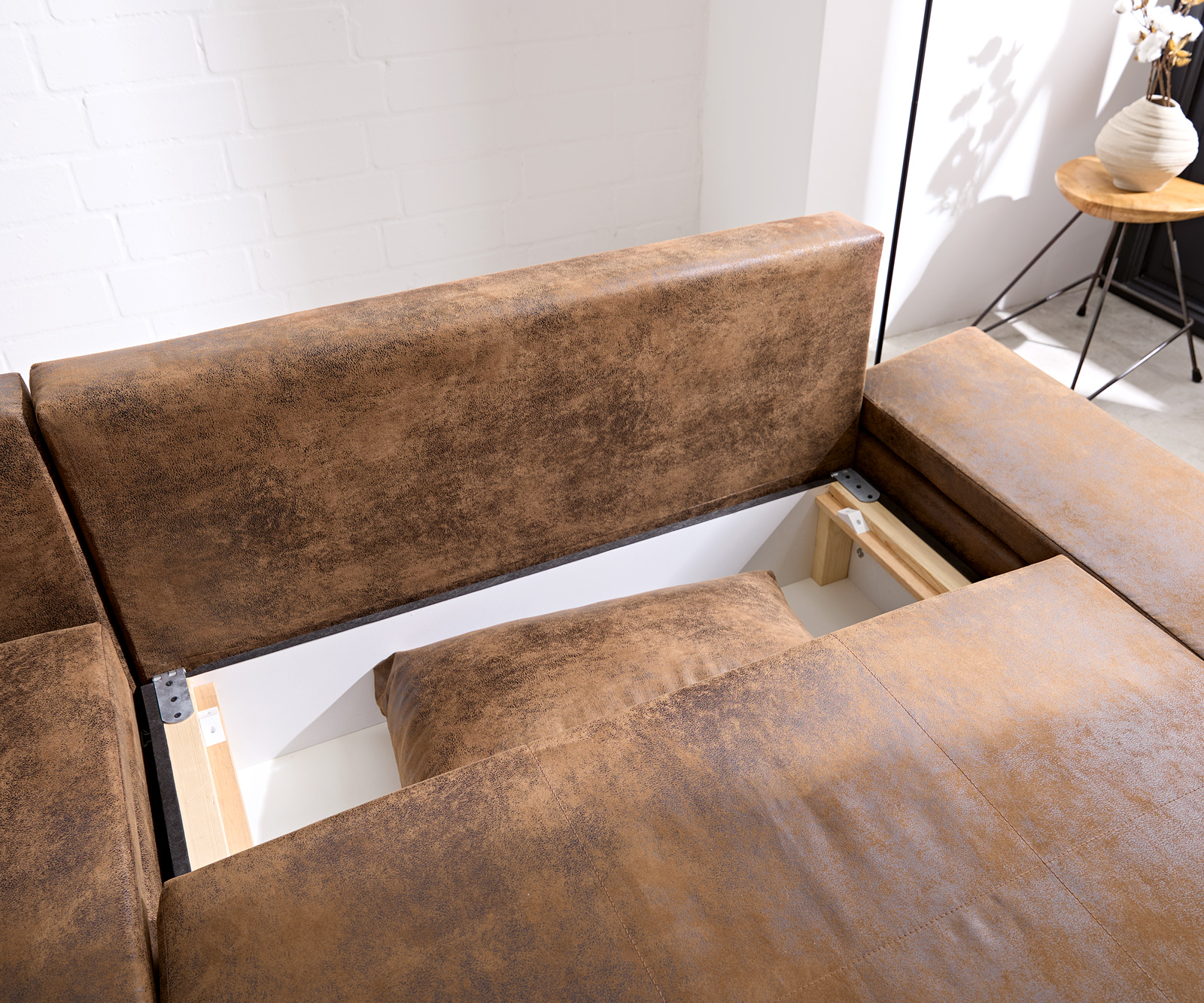 Abilene lakókanapé gazdag felszereltsége lehetővé teszi a kellemes együttlétet baráti társaságban, valamint kiváló fekvőkomfortot nyújt zavartalan éjszakai pihenéshez. A kanapé pillanatok alatt praktikus vendégággyá alakítható váratlan vendégek számára. A beépített ágyneműtartó bőséges helyet kínál ágyneműk, takarók és párnák tárolására. A maximális ülőkomfortot a karfa, a három háttámla párna és a jobb oldalon elhelyezett rekamié biztosítja, amelyek minden pozícióban kényelmet nyújtanak. A tartós, barna színű mikrovelúr huzat elegáns vintage megjelenéssel rendelkezik, tovább fokozva a kellemes komfortérzetet. A Nosag rugózás teszi teljessé a sarokkanapé funkcionális felszereltségét, amely a steppelt ülőfelületet egy igazi pihenőoázissá varázsolja.