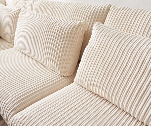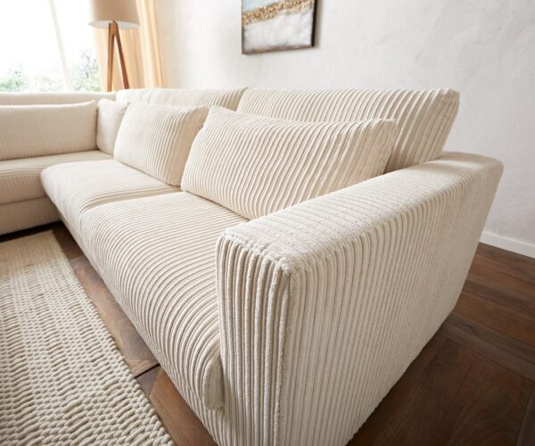 Teljesen trendi! Az Isla sarokkanapé divatos kordbársony bevonattal készült, amely visszafogott bézs színű. A feltűnő kárpit színe miatt könnyedén illeszkedik sokféle berendezési stílushoz, és a magas minőségű Nosag rugózásnak, valamint a kényelmes derék- és háttámasz párnáknak köszönhetően sok órán át kényelmesen lehet ülni és feküdni a középső részen és a bal oldali hosszú fotelon.