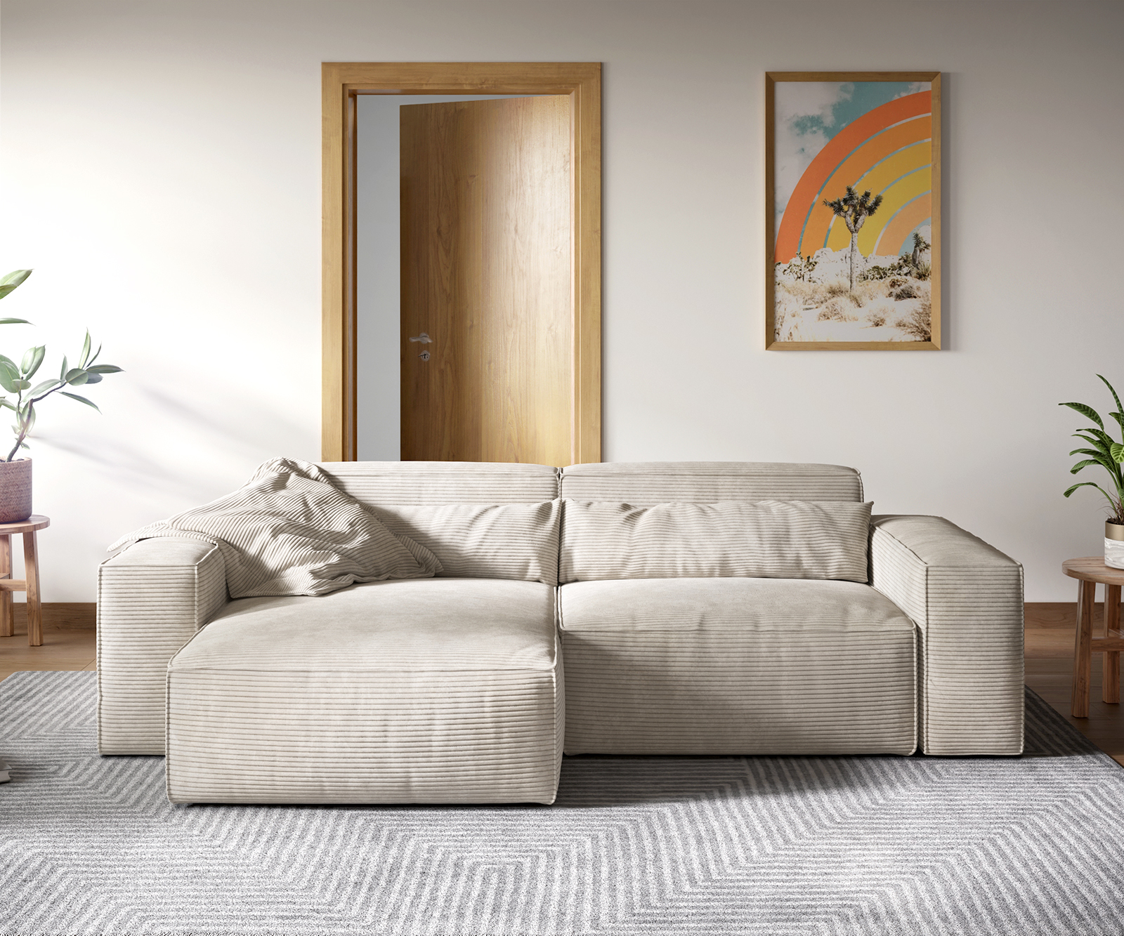 A gyönyörű, világos bézs kordbársony különösen hívogató megjelenést kölcsönöz a Sirpiónak. A különleges ülési komfortot a puha párnázat és a kiváló minőségű rugózás biztosítja. Számos laza párna és elegánsan széles karfa teszi ezt az egyedi design darabot otthonod kényelmes és páratlanul szép központi elemévé.