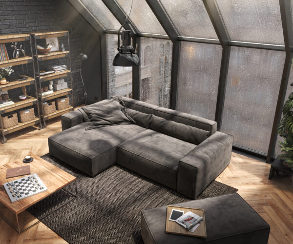 Egyedülállóan szép design – Sirpio sarokkanapé extra mély ülőfelülettel khaki barna színben