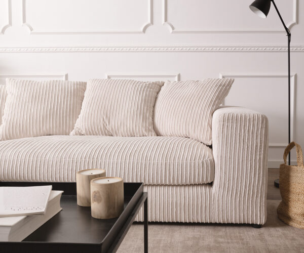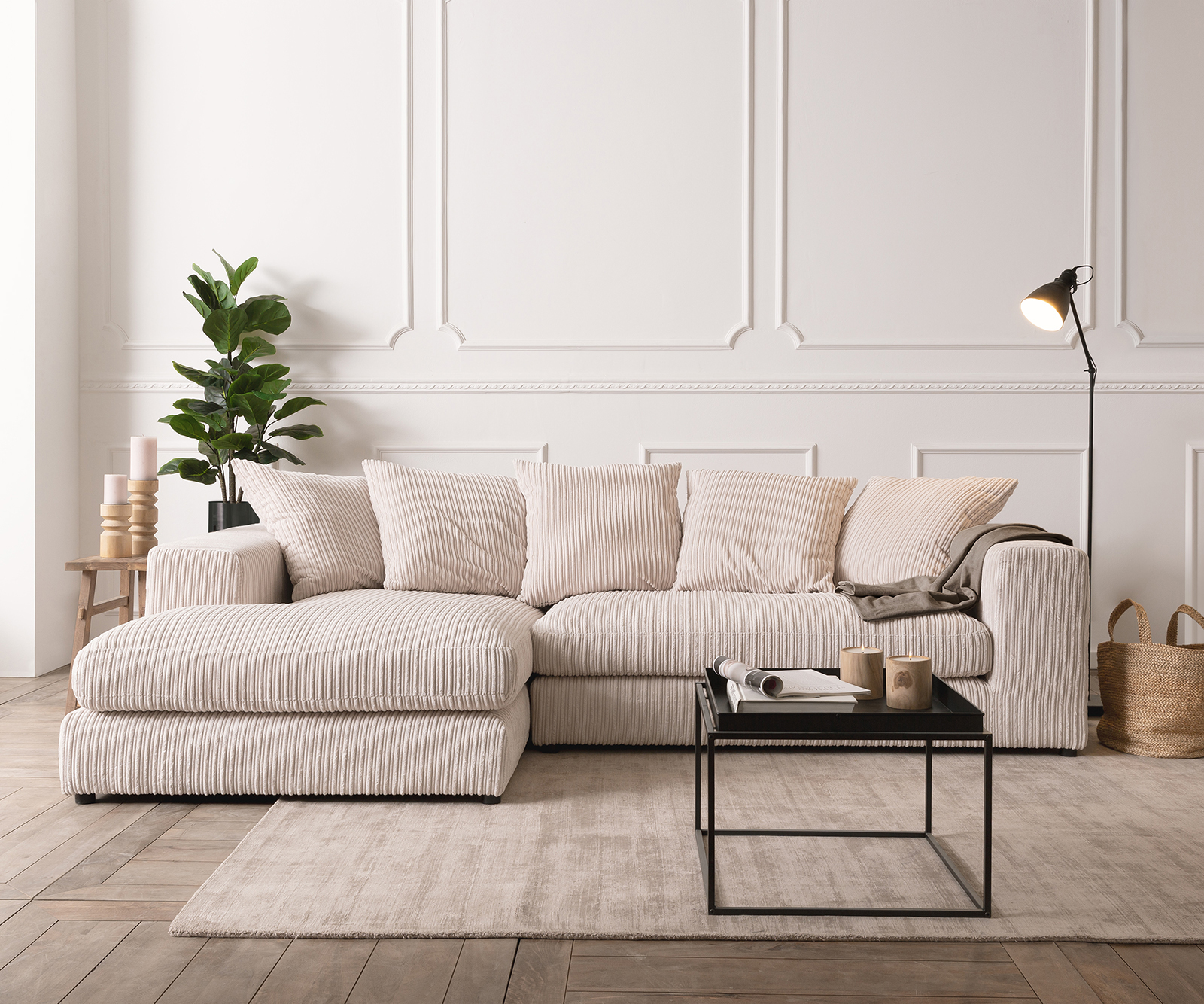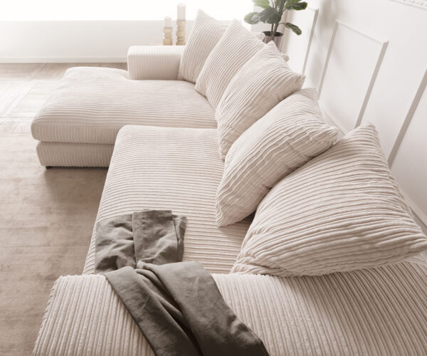 Gazdag ülő- és fekvőfelületeivel, valamint alacsony magasságával a stílusos L-kanapé Svada különösen kényelmes és hívogató hatást kelt. A magas komfortérzethez, amelyet a kárpitozott sarokkanapé nyújt, jelentősen hozzájárul az öt nagy méretű háttámaszpárna is, melyek a csomag részét képezik. A kellemesen puha tapintásról a gondosan kidolgozott, jellegzetesen strukturált kordbársony anyag gondoskodik, amivel az L-alakú kanapé kárpitozva van.