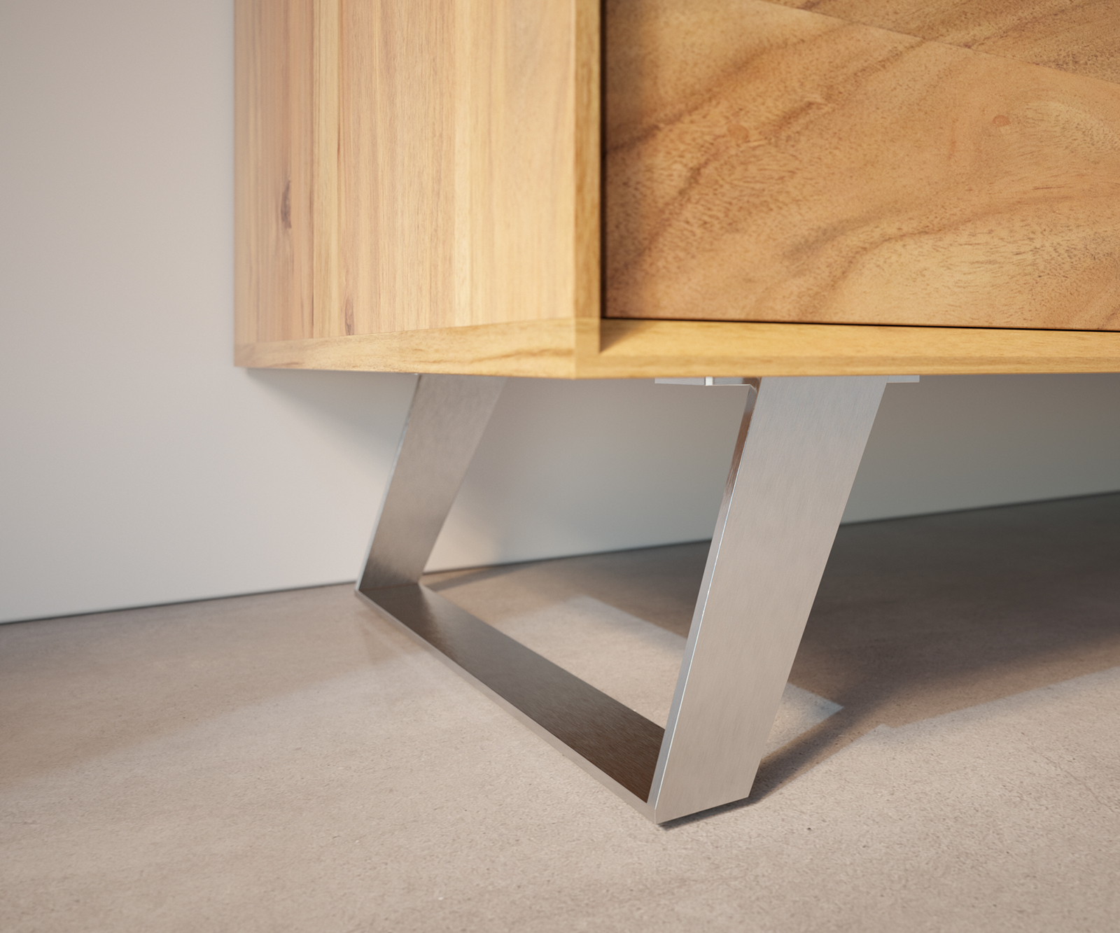 Nožičky jsou vyrobeny z ručně broušené nerezové oceli. Náročný proces broušení a kartáčování vytváří poměrně drsný povrch s mnoha drobnými leštícími stopami. Ty zajišťují neuvěřitelně krásný lesk a chrání materiál před korozí a opotřebením.