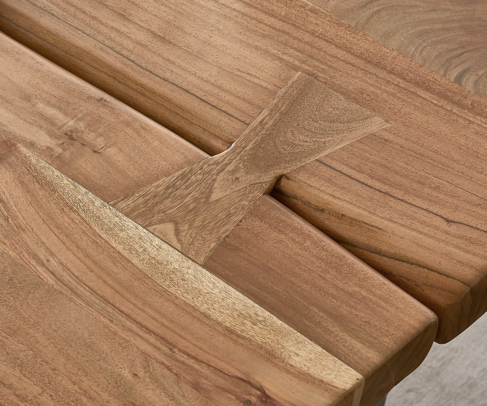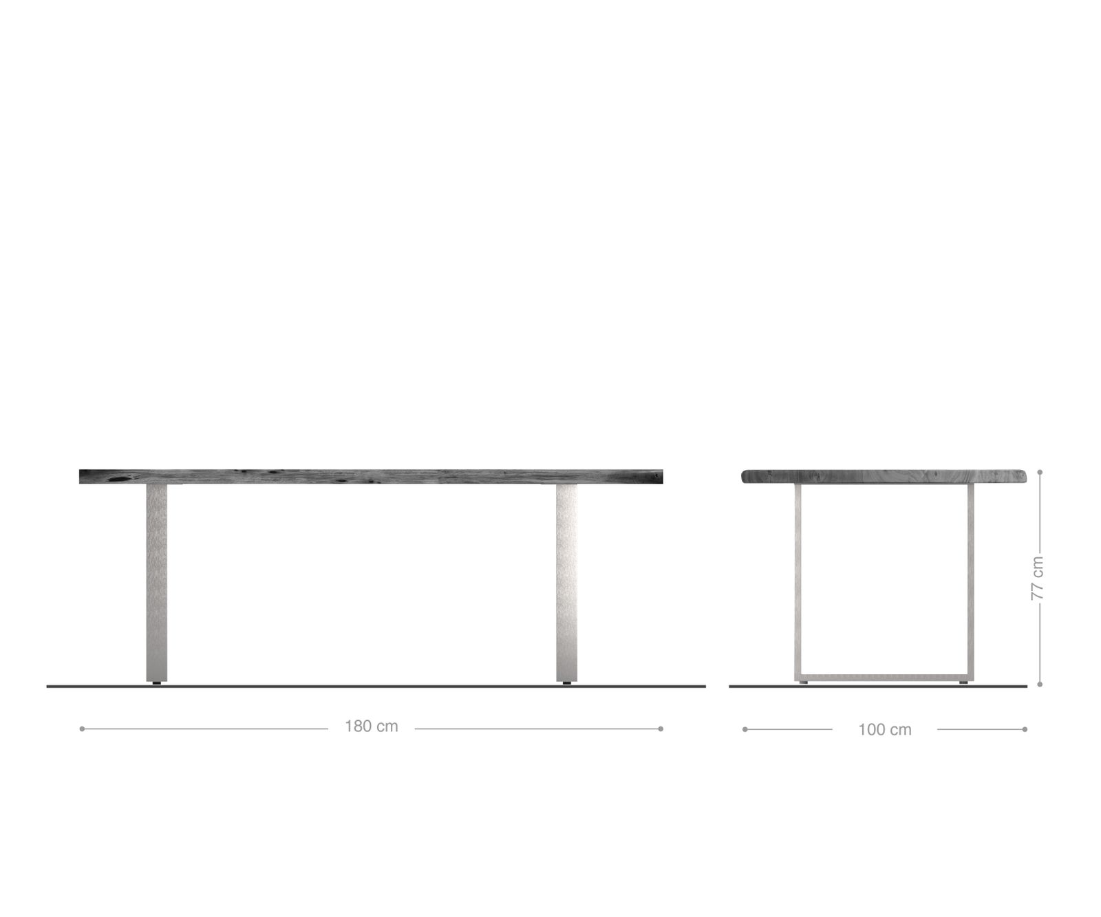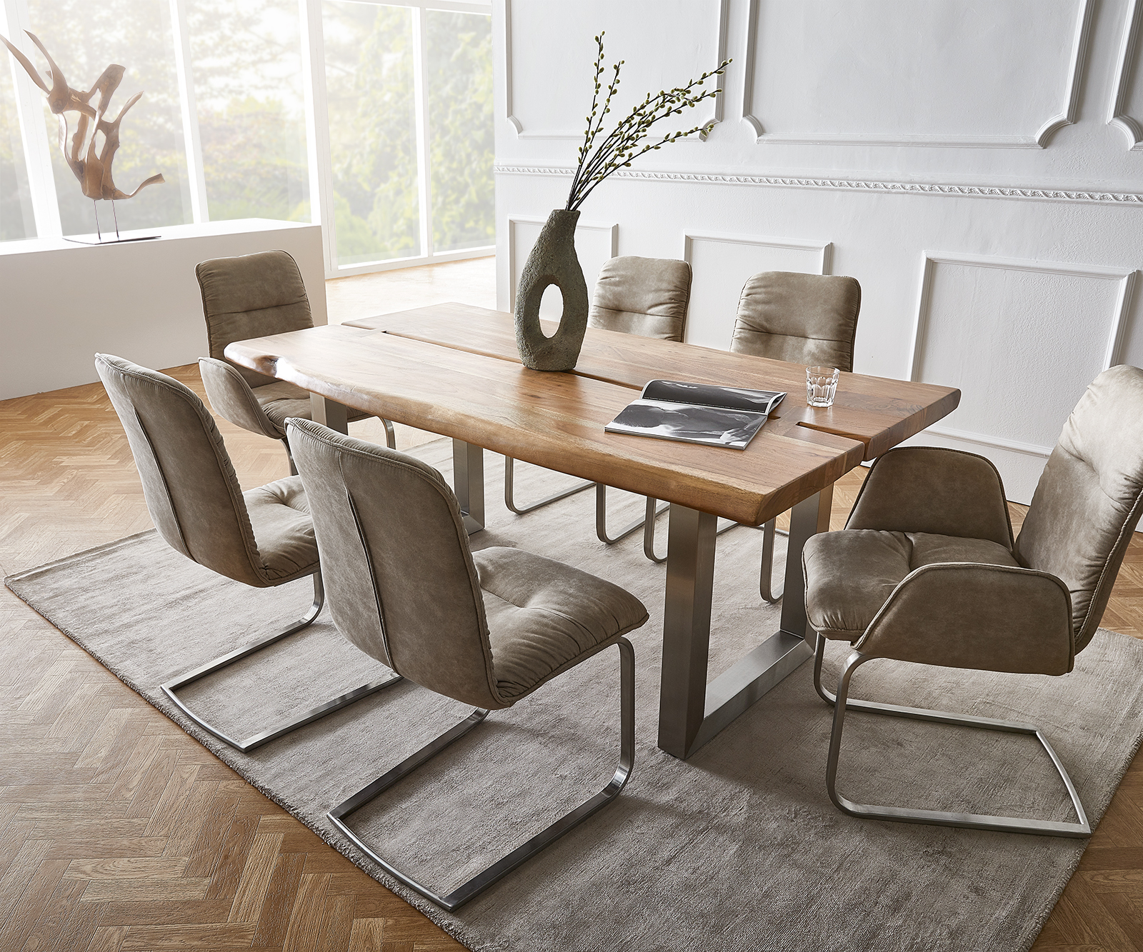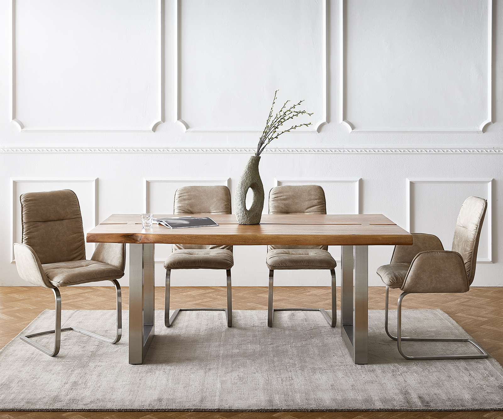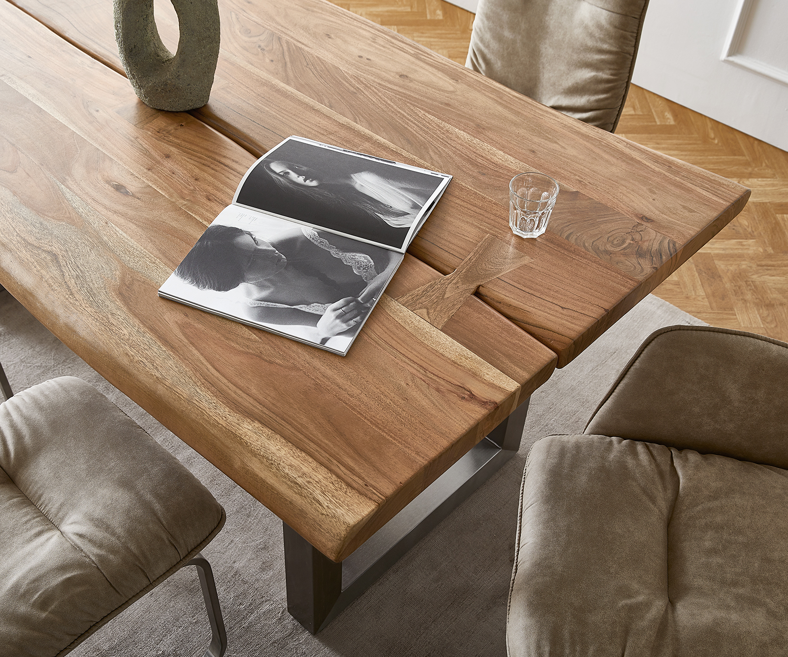 Dvojitá deska v přírodní barvě spočívá na robustním a širokém rámu stříbrné barvy z nerezové oceli. Důmyslně zapracované motýlí spojky dodávají stolu z masivního dřeva potřebnou stabilitu. Každý stůl z akátového dřeva je jedinečný, přesně takový, jaký si ho mohou dovolit lidé, kteří si rádi zařizují nábytek individuálně. Rozměry se mohou mírně lišit v tloušťce materiálu a tvaru kvůli speciálnímu výrobnímu procesu. Krásný stůl z masivního dřeva nabízí přírodní inkluze, suky nebo nerovnosti. Tyto zvláštní rysy podtrhují přírodní charakter akátového dřeva.