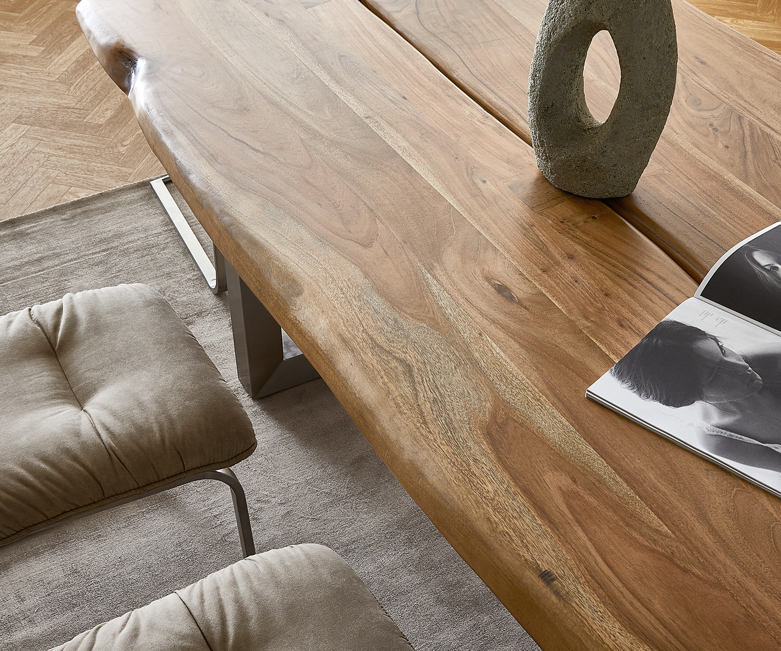 Ušlechtilý stromový stůl z nábytkové řady Live-Edge s přírodní hranou stromu je stůl o třídu výjimečnější, který upoutá pozornost každého. Je vhodný jako exkluzivní jídelní stůl a vypadá skvěle v samostatné jídelně i v prostorné kuchyni. Nejkrásněji vypadá zcela samostatně; pro tento mimořádný vzhled se můžete bez obalu obejít bez ubrusu. Elegantní dřevěný stůl zkombinujte s odpovídajícími židlemi. Velmi dobře k němu vypadá také lavice, zejména pokud stůl používáte jako kuchyňský stůl. Stůl ze stromu má desku, která se skládá ze dvou masivních desek. Masivní dřevo akácie se výborně hodí k výrobě nábytku. Je robustní, ale přesto má elegantní vzhled. Deska stolu, která není stoprocentně uzavřená, zaujme jemným přírodním leskem. Stejně působivý je i přírodní tvar. Jednotlivé hrany stromů v přírodním odstínu jsou viditelné, takže stůl z masivního dřeva vnese do vašeho domova originální a odvážný vzhled.