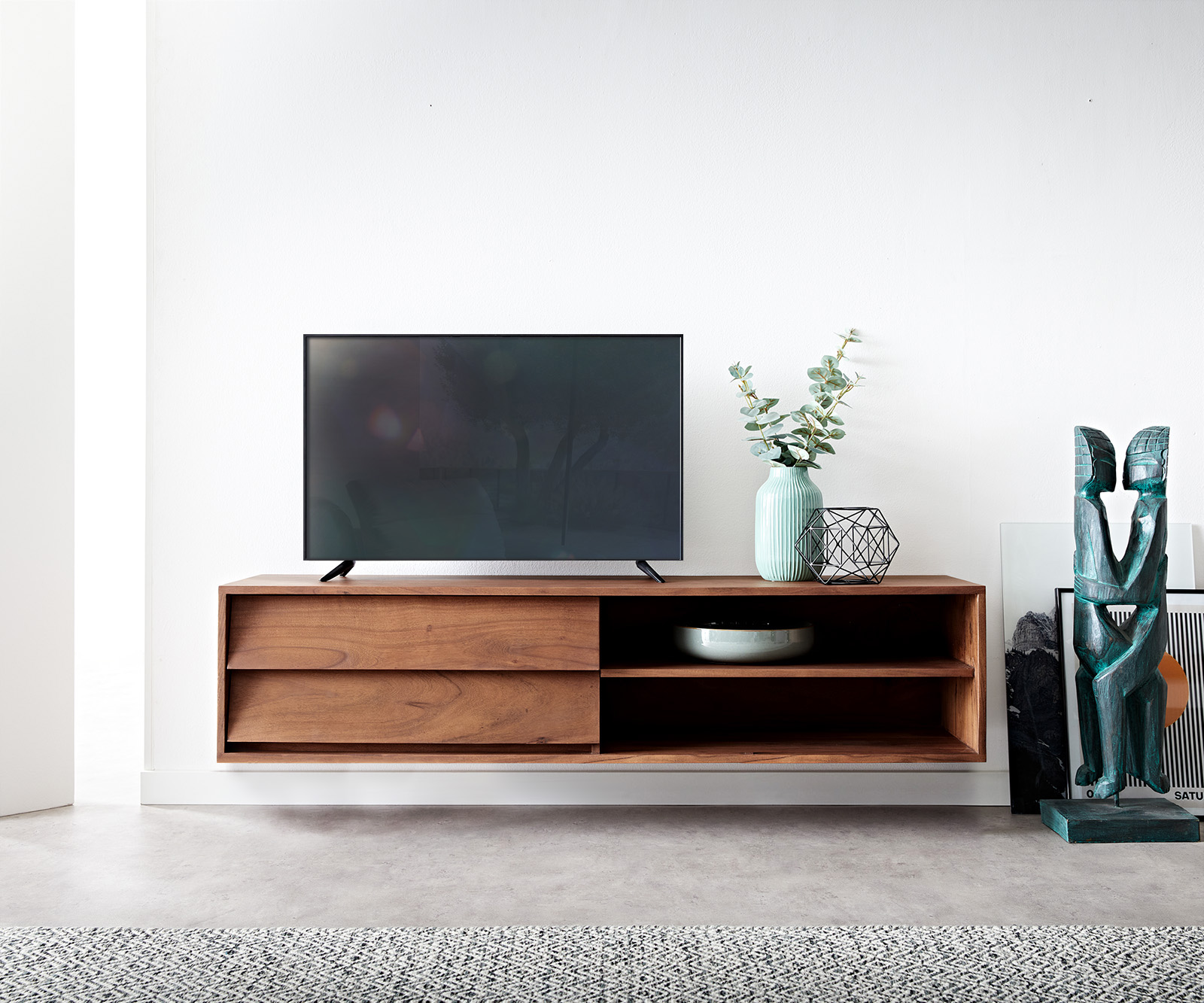 TV stolek Eloi 145×35 cm hnědá akácie 2 šuplíky 2 přihrádky závěsný