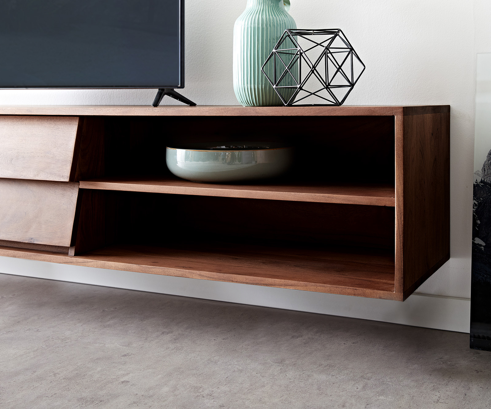TV stolek Eloi 145x35 cm hnědá akácie 2 šuplíky 2 přihrádky závěsný