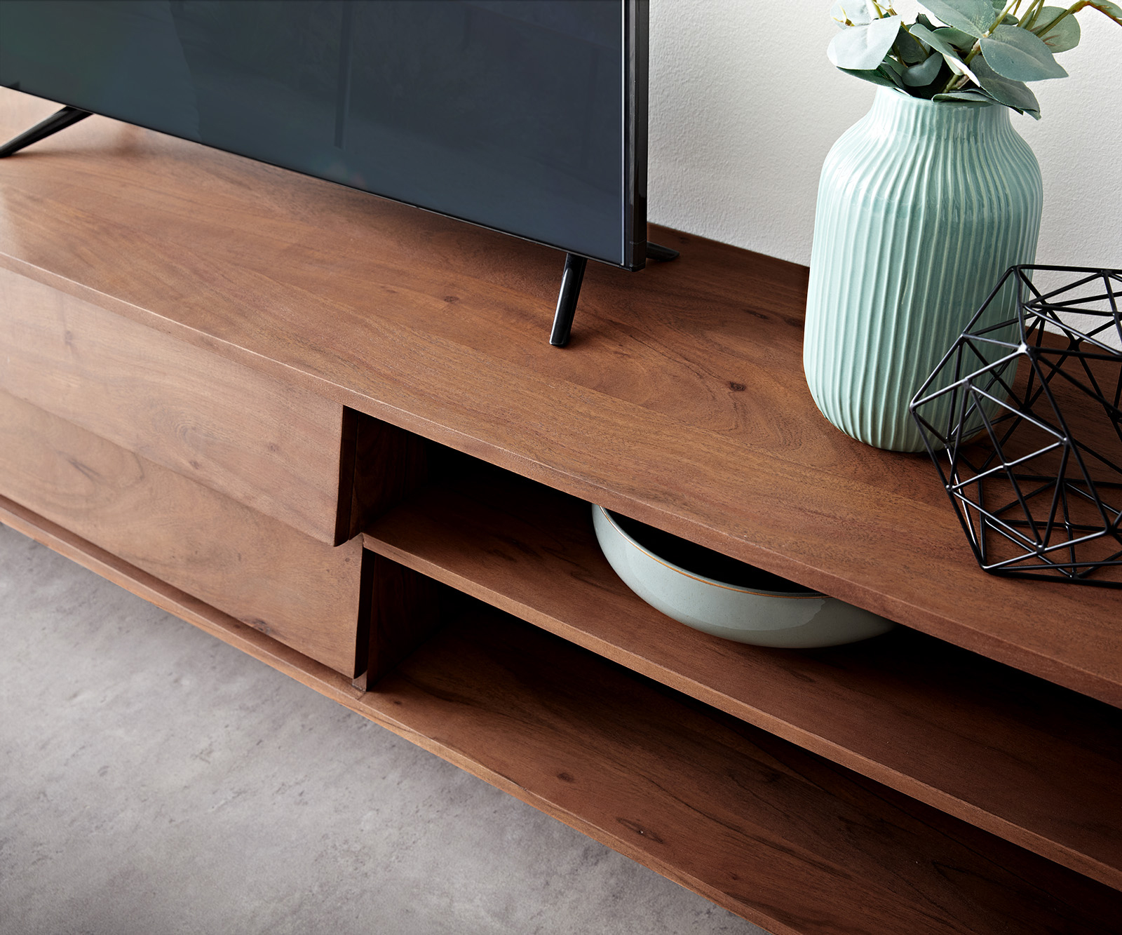 Akátové dřevo v matné hnědé barvě působí moderně a elegantně. Praktický korpus se dvěma zásuvkami.
