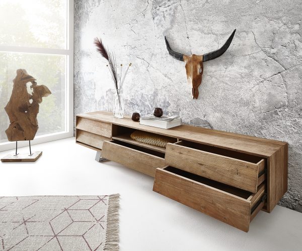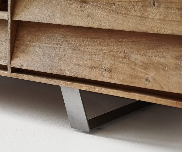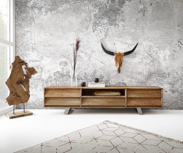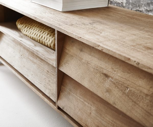 Tato extravagantní TV deska z naší kolekce Exotic Wood se prezentuje výrazným designovým jazykem a originální přírodní krásou. Staré dřevo bylo pečlivě vybráno a důmyslně ručně zpracováno do podoby nábytkového prvku s působivým efektem. Vzácný přírodní materiál okouzluje svým nezaměnitelným charismatem, které vyplývá z jeho detailní kresby, jež je u každého kusu individuálně výrazná.