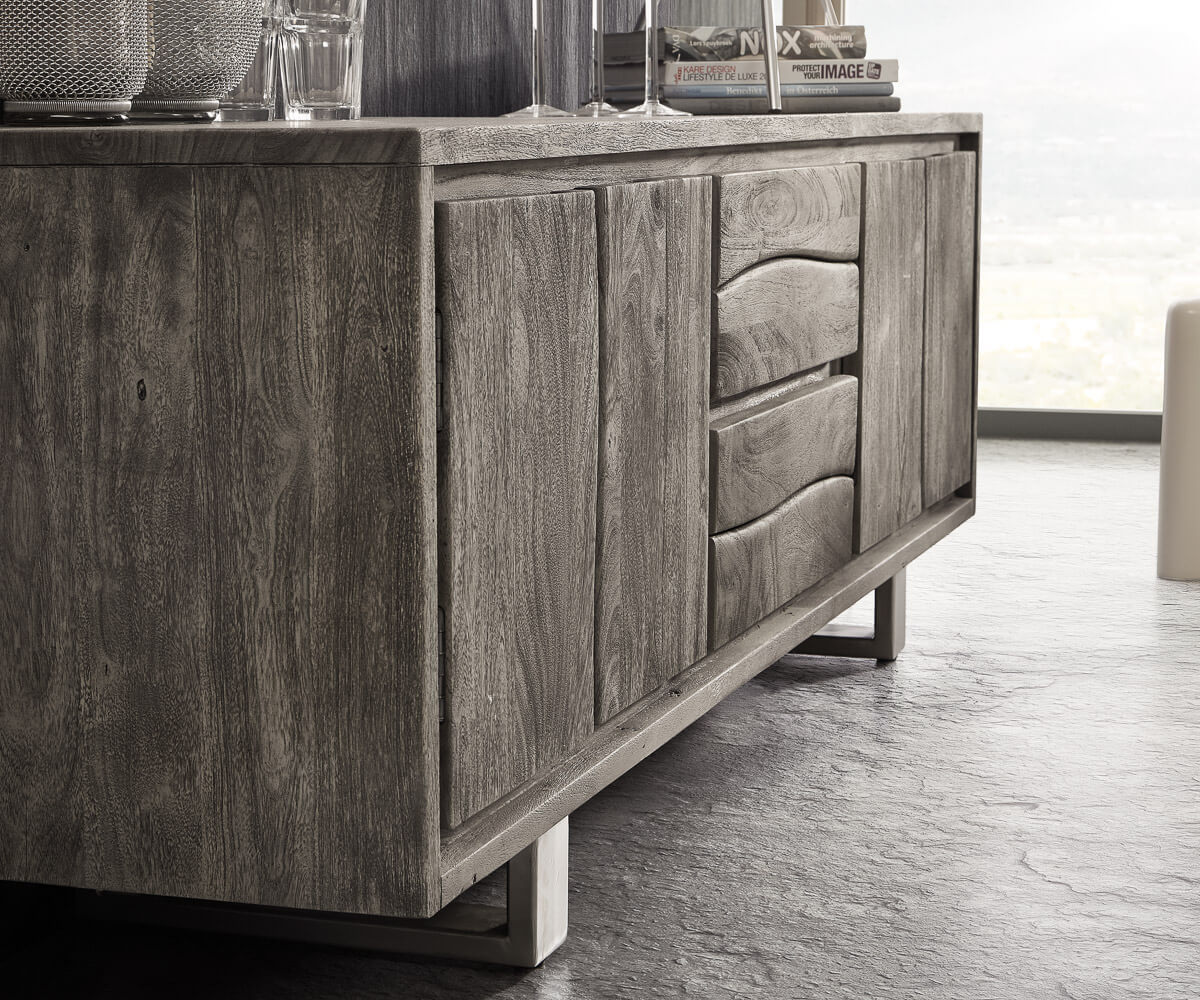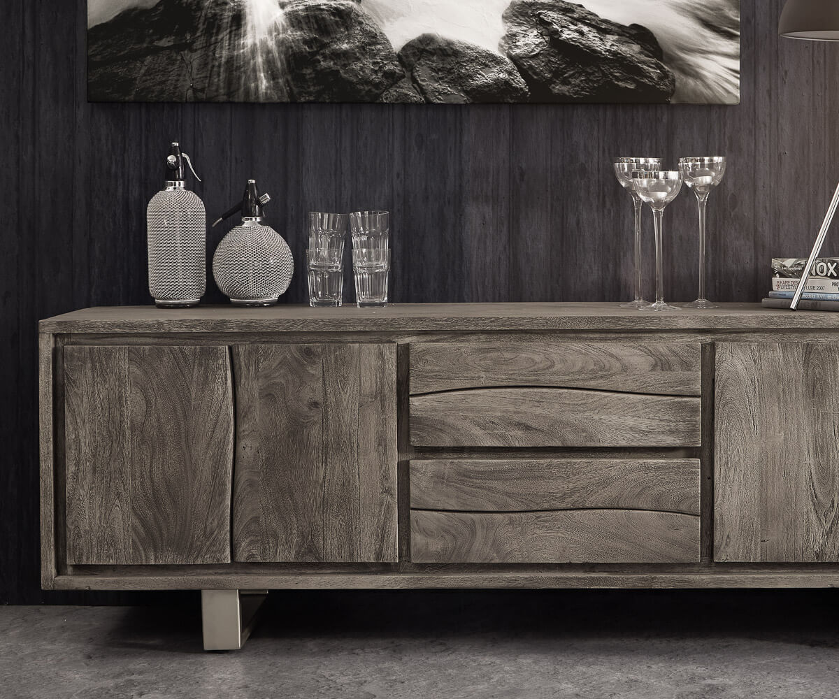 Nízká deska Live-Edge je estetickou symbiózou masivního akáciového dřeva a nerezové oceli. To mu dodává mimořádně nadčasový charakter, pokud jde o styl, který ještě podtrhuje minimalistický design. Smykem tvarované a mírně dovnitř posunuté nohy lowboardu zajišťují nejen bezpečné postavení, ale také atraktivní vzhled. U tohoto modelu lze nohy z nerezové oceli namontovat ve dvou různých vzdálenostech, takže je lze optimálně přizpůsobit podmínkám v místnosti.
