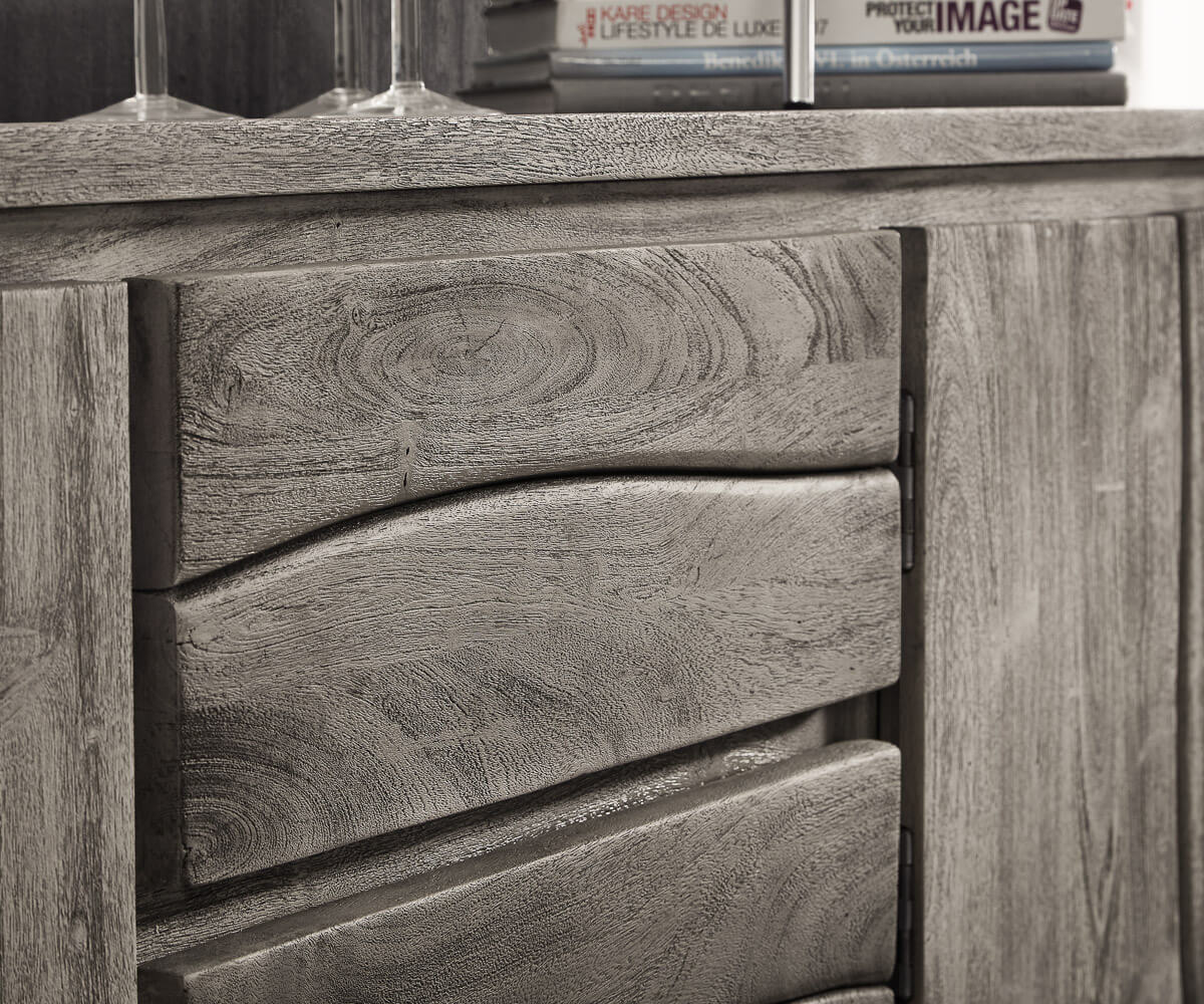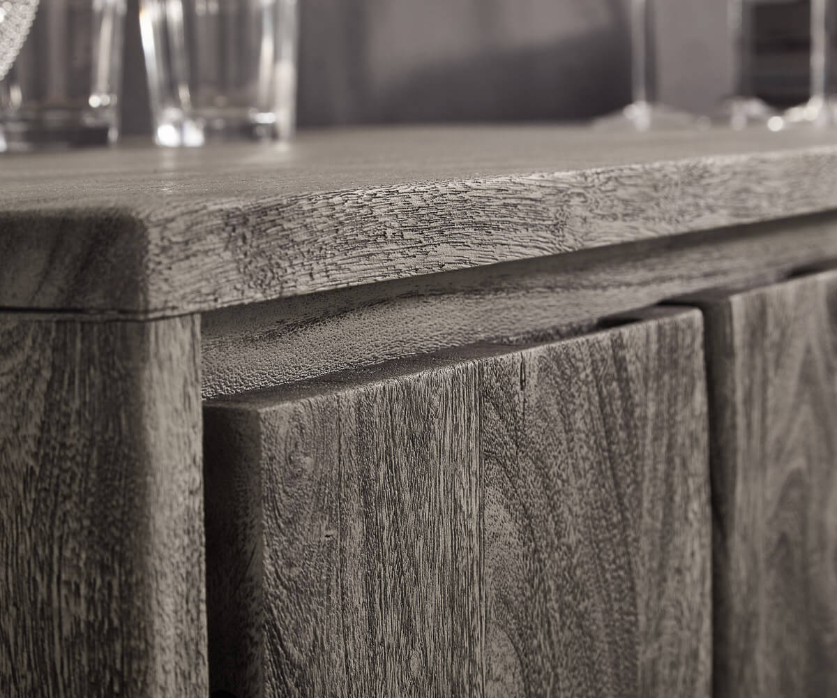 Ačkoli je poměrně střízlivý design tohoto televizního nábytku rozbit přírodní hranou akátu na čelech dvířek, je u tohoto televizního stolku přesto zajištěna téměř dokonalá symetrie: uprostřed dvě zásuvky umístěné nad sebou nabízejí dostatek úložného prostoru pro drobnosti, časopisy nebo občerstvení přímo u pohovky a televizoru. Vlevo a vpravo jsou praktickými dvířky přístupné přihrádky rozdělené policemi. Povrchy TV příborníku jsou ručně povrchově upraveny stříbrošedou barvou platina, takže přirozené barevné přechody ve dřevě vystupují obzvlášť charakteristicky.