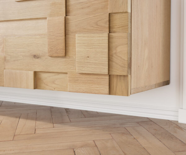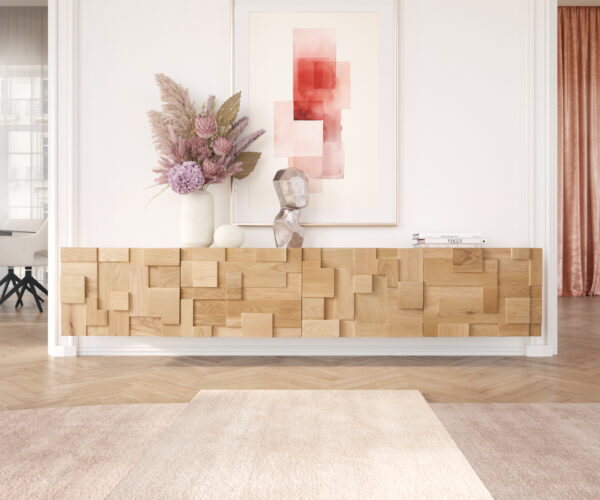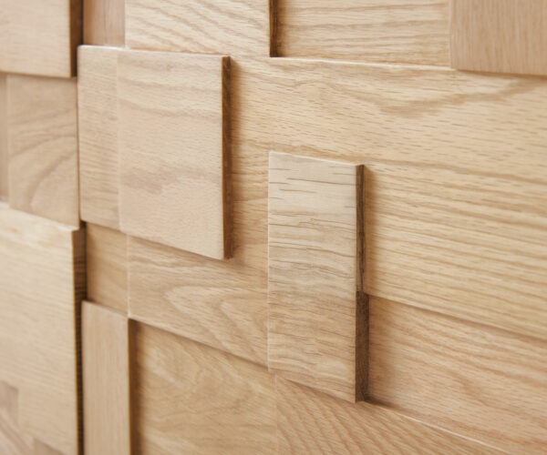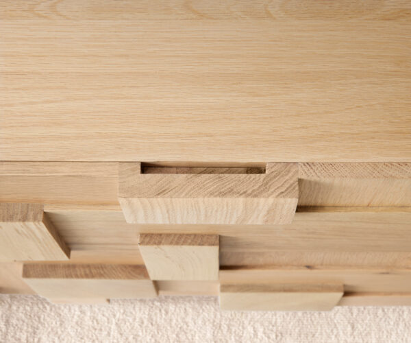 Jedinečná nízká deska Puzzle vyrobená z cenného dubu pocházejícího z udržitelného lesního hospodářství zaujme propracovanou, vystupující 3D přední stranou s nápadně krásným vzorem puzzle. Pro design čela jsou pečlivě vybírány jednotlivé prvky z masivního dřeva, které jsou trpělivě ručně skládány ve vertikálním i horizontálním směru, aby vytvořily harmonický celkový obraz, a připevněny k MDF nosiči. Použití obdélníkových a čtvercových tvarů v různých tloušťkách materiálu vytváří úchvatný 3D charakter plný hloubky a trojrozměrnosti, který dělá z každé spodní desky exkluzivní unikát.
