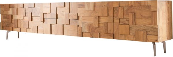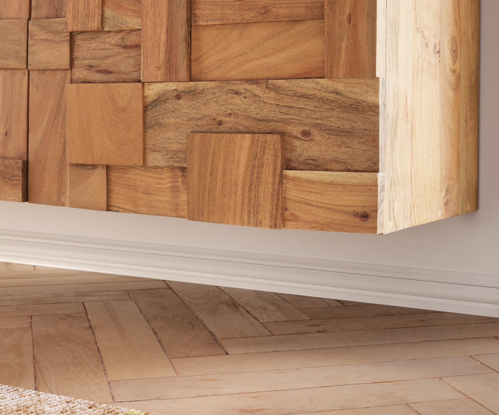 Jedinečná nízká deska Puzzle vyrobená z cenného akátového dřeva pocházejícího z udržitelného lesního hospodářství zaujme propracovanou vystupující 3D přední stranou s nápadně krásným vzorem puzzle. Pro design čela jsou pečlivě vybírány jednotlivé prvky z masivního dřeva, které jsou trpělivě ručně skládány ve vertikálním i horizontálním směru, aby vytvořily harmonický celkový obraz, a připevněny k MDF nosiči. Použití obdélníkových a čtvercových tvarů v různých tloušťkách materiálu vytváří úchvatný 3D charakter plný hloubky a trojrozměrnosti, který dělá z každé spodní desky exkluzivní unikát.