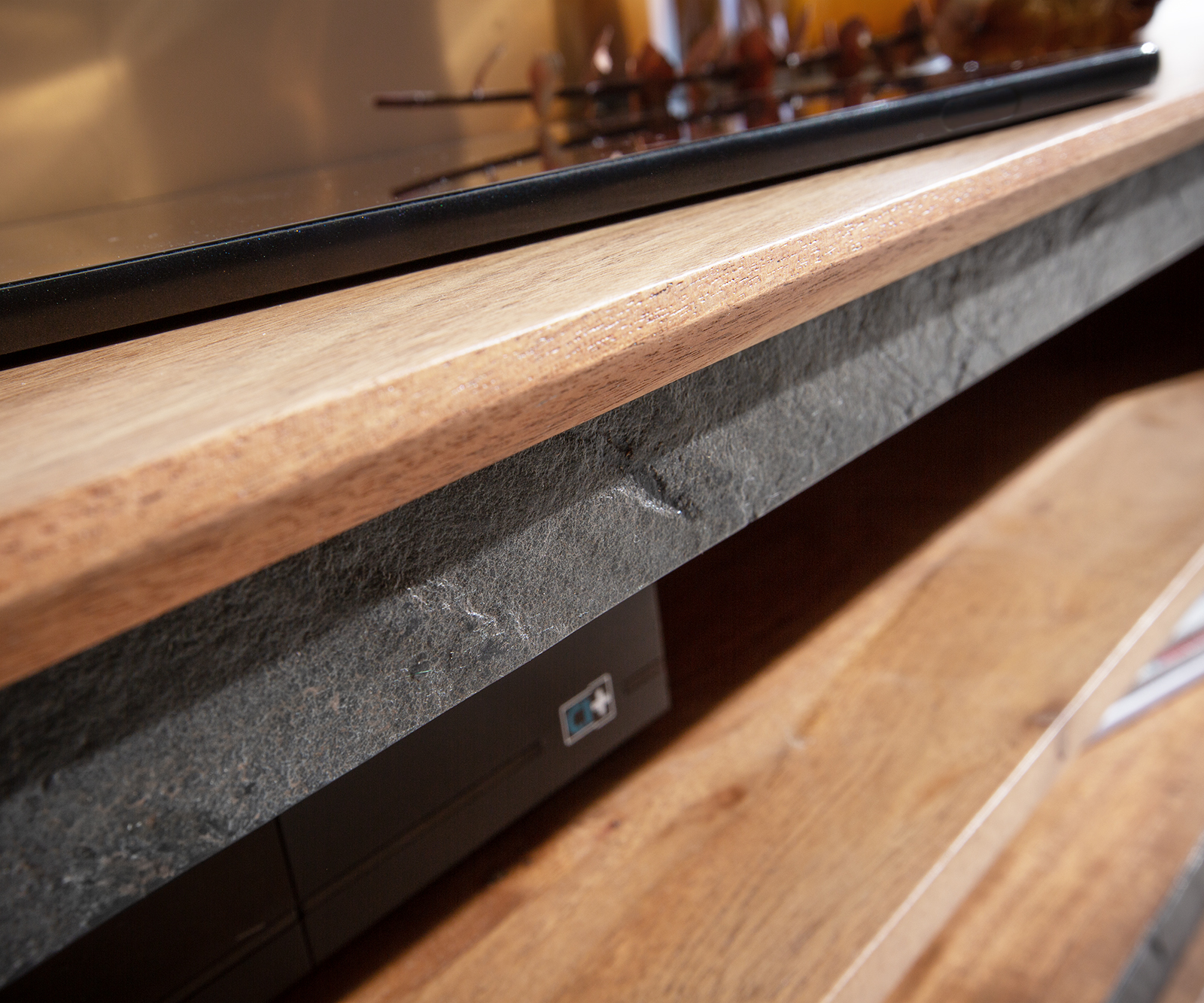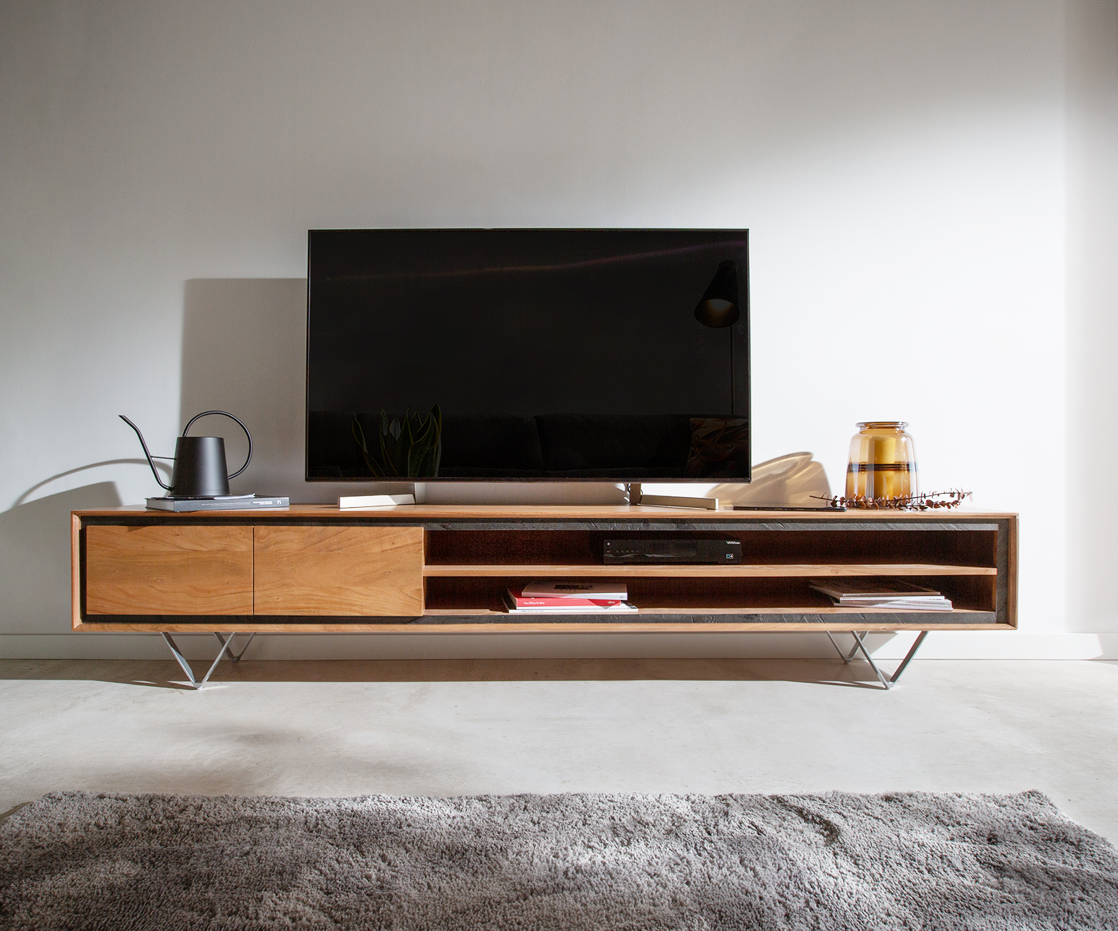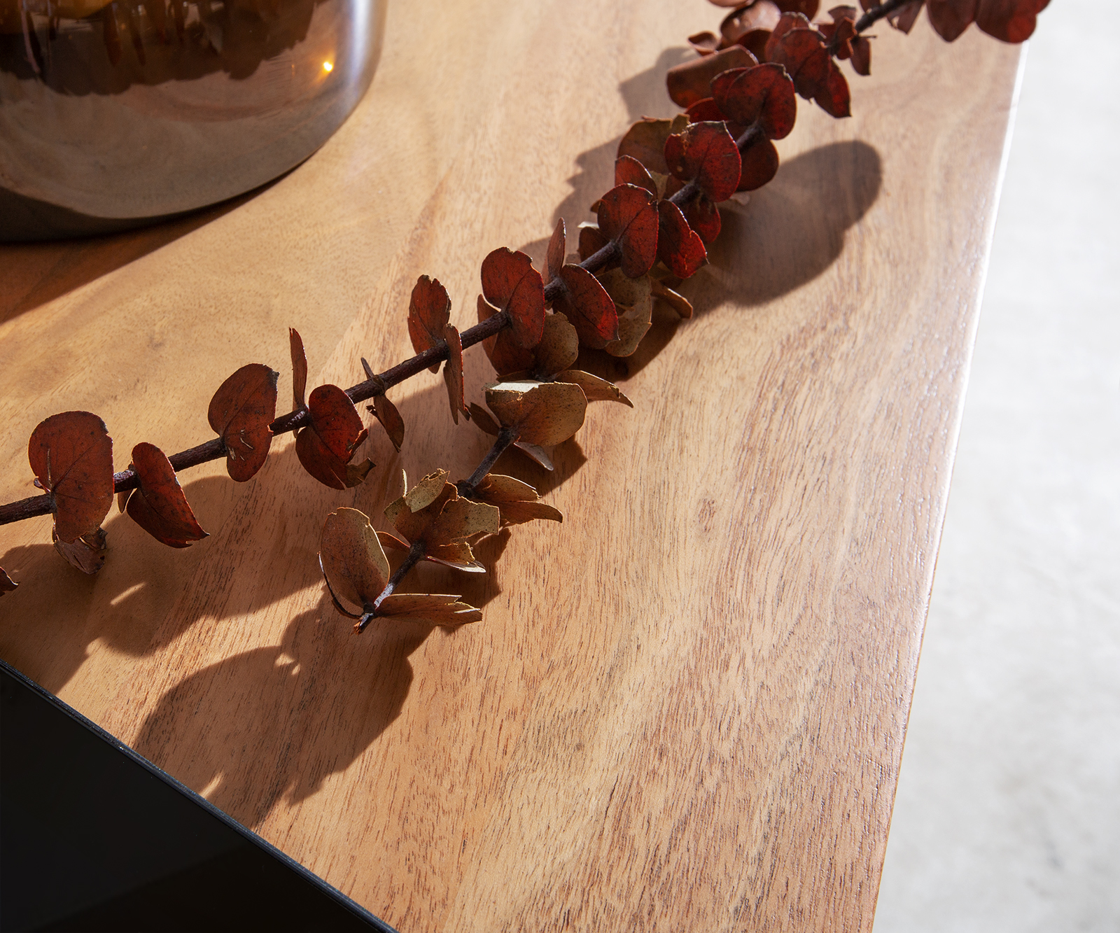 Filigránový rám z nerezové oceli odolné proti poškrábání dodává nábytku z masivního dřeva příjemnou lehkost a působí téměř beztížně. Stříbrná barva dokonale ladí s akátovým dřevem a kamennou dýhou a dodává přírodním materiálům další lesk.