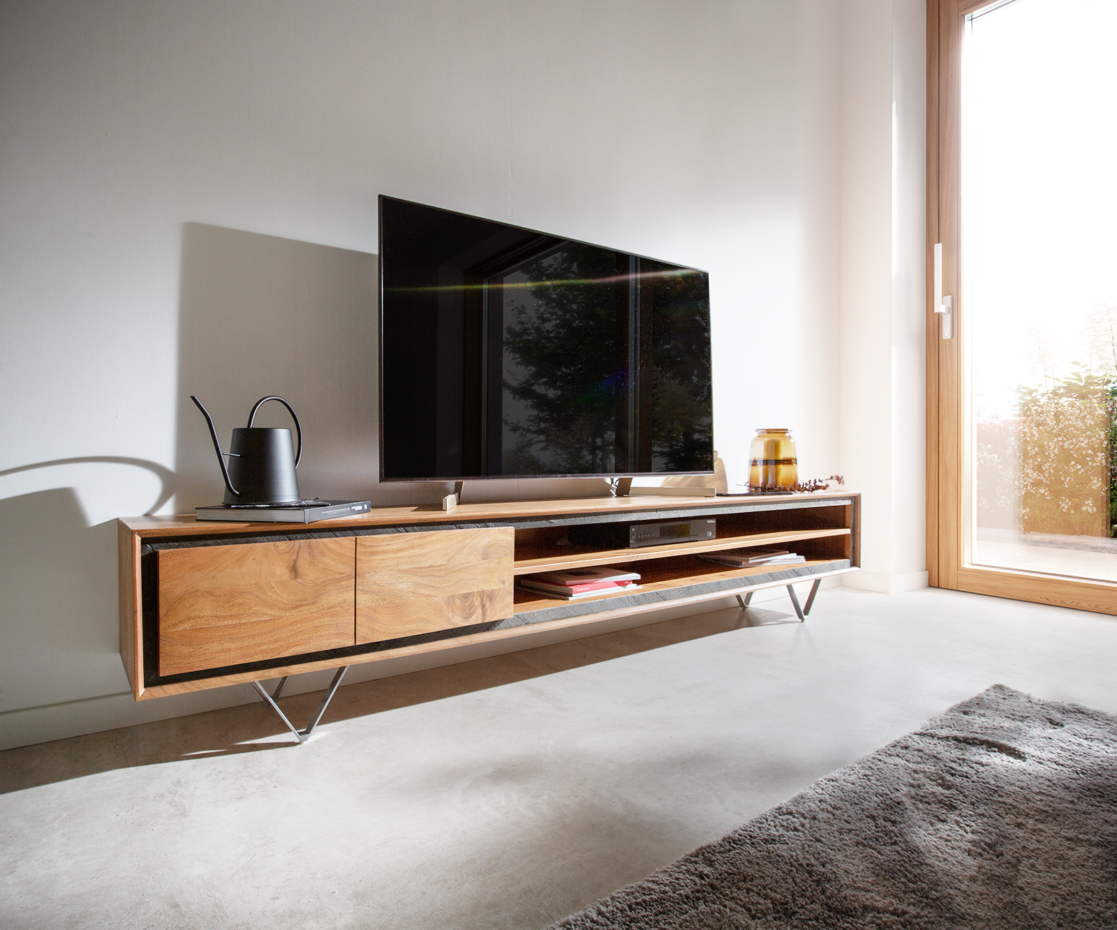 S nízkou deskou Stonegrace vnesete do svého obývacího pokoje nezaměnitelnou krásu a praktický úložný prostor. Lowboard se čtyřmi otevřenými přihrádkami a dvěma dvířky, působivě vyrobený z přírodního akáciového dřeva a tmavé dýhy z pravého kamene, nabízí spoustu místa pro vaši zábavní elektroniku. Každá ze dvou horních přihrádek byla opatřena kabelovou průchodkou, která snadno skryje nevzhledné kabely.