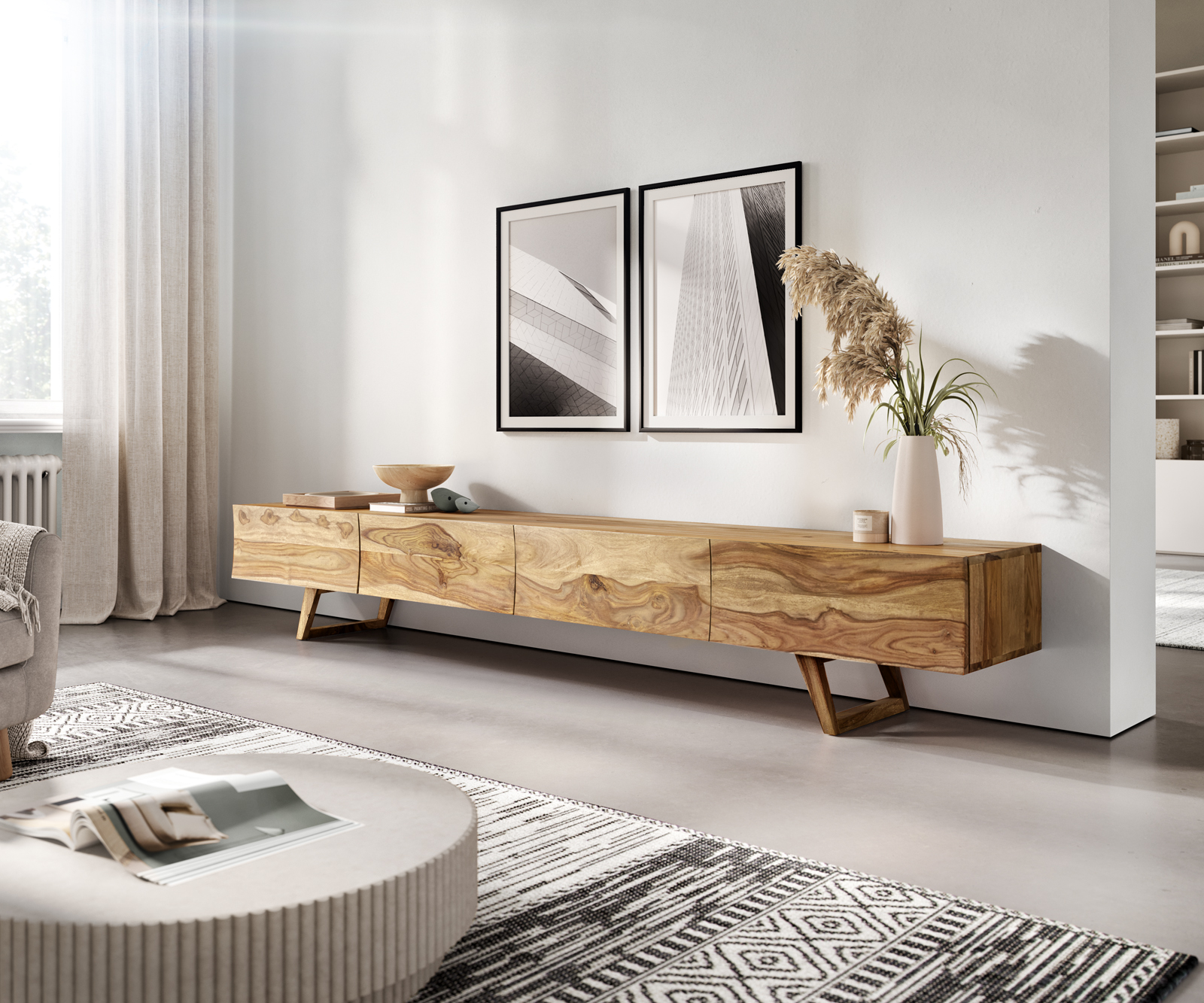 Díky svému atraktivnímu designu je nízká deska Wyatt obzvláště inspirativní pro použití jako televizní stolek. Tento kus nábytku, vyrobený z masivního sheeshamu , svým okouzlujícím vzhledem vytváří v obývacím pokoji přirozené akcenty. Přírodní a olejovaný povrch představuje pestrou kresbu na mnohotvárných barevných tónech. Televizní stolek je navíc důmyslně ručně vyroben a zaujme prvotřídním zpracováním. Televizní nábytek se navíc hodí k mnoha stylům vybavení a lze jej bez námahy kombinovat.