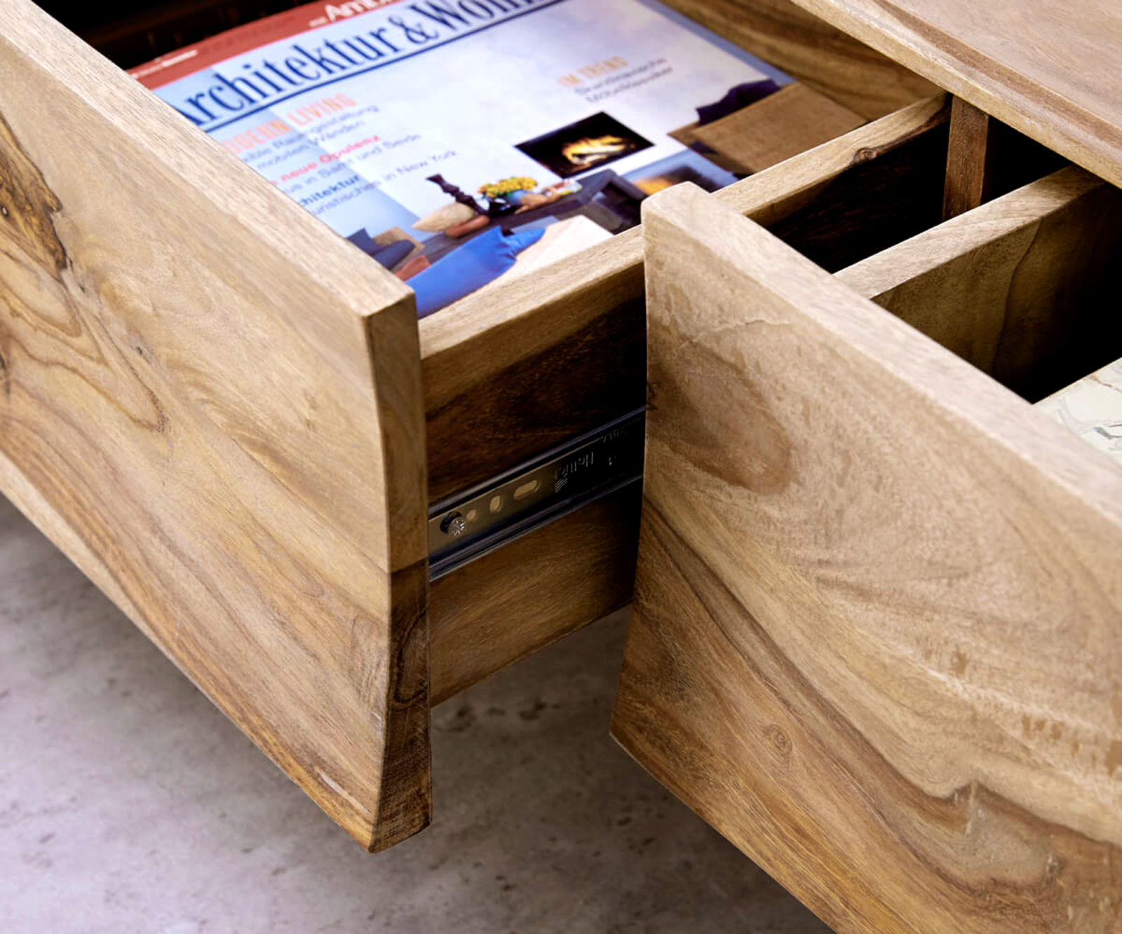 Velkoryse dimenzovaný televizní stolek s horní policí poskytuje dostatek prostoru i pro velkou plochou televizi a pojme i BluRay přehrávače a přijímače. Televizní stolek nabízí všestranný úložný prostor ve čtyřech zásuvkách pod ním. Fascinující na zásuvkách jsou extravagantně tvarované panely.