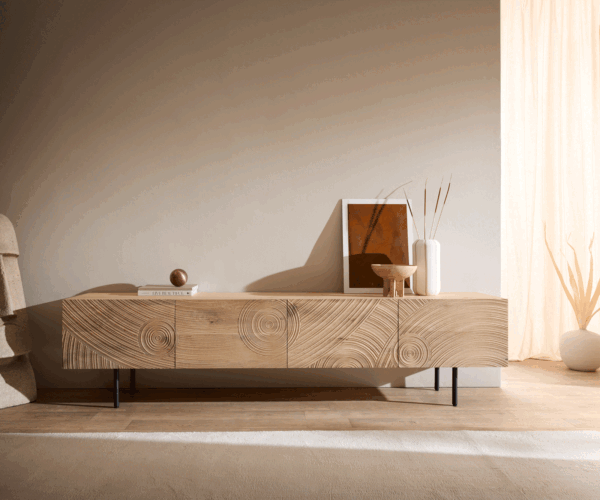 Az Ashara TV szekrény modern lakberendezést és természetes hangulatot hoz otthonába. Kiváló minőségű természetes tölgyből készült, finoman kidolgozott 3D előlapjaival, amelyek struktúrát és karaktert kölcsönöznek a lakótérnek. Négy ajtó mögött tágas tárolóhely található, amelyet kényelmes soft-close és push-to-open zárószerkezetek egészítenek ki. A beépített kábelátvezetésnek köszönhetően a technikai eszközei tökéletesen rendezettek maradnak. A fekete fém kerek lábak markáns hangsúlyt adnak, és egyben magas stabilitást biztosítanak.