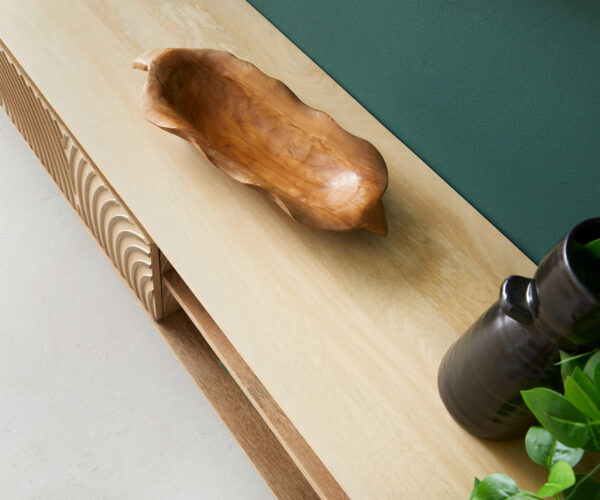 Praktikus TV szekrény nyitott és zárt elemekkel. A sárgaréz előlapok stílusos etno mintázata adja meg a bútor karakterét. A TV szekrény természetes világos középbarna mangó színben tündököl, enyhe szürkés-sárgás árnyalatokkal.