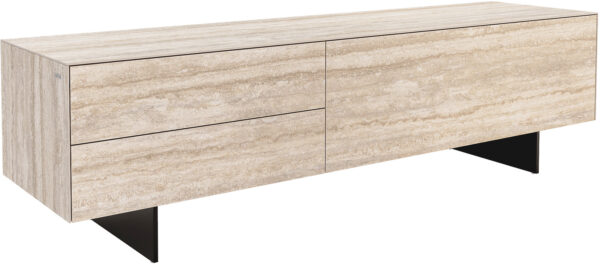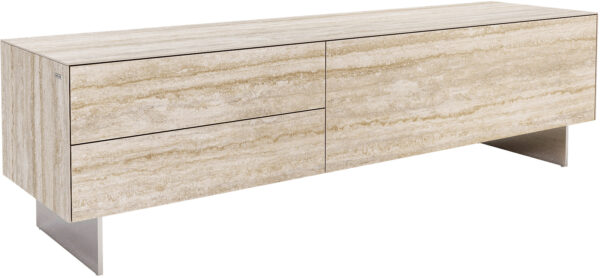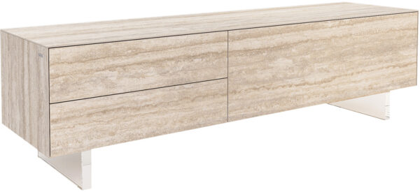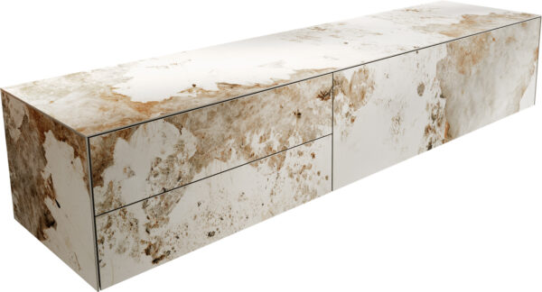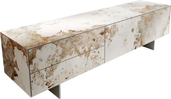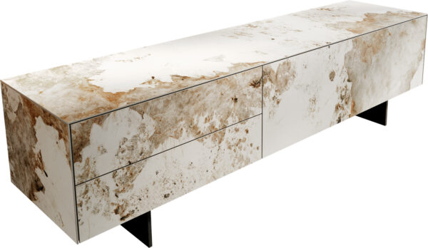 Valódi, olasz Laminam® kerámia finom fehér és krém árnyalatokban, finom erezett mintázattal, amely egyedi bájt kölcsönöz a CUOR TV szekrénynek, melyet a világos travertin kő inspirált. Meleg mogyoró árnyalatok és időtlen esztétika teremtenek nyugodt eleganciát, ahol a harmónia és az élénk dinamika felejthetetlen módon egyesül. Még lenyűgözőbb hatás érdekében a bútordarab stabil tartóval közvetlenül a falra szerelhető. A lebegő megjelenés könnyedséget és különösen harmonikus megjelenést kölcsönöz.