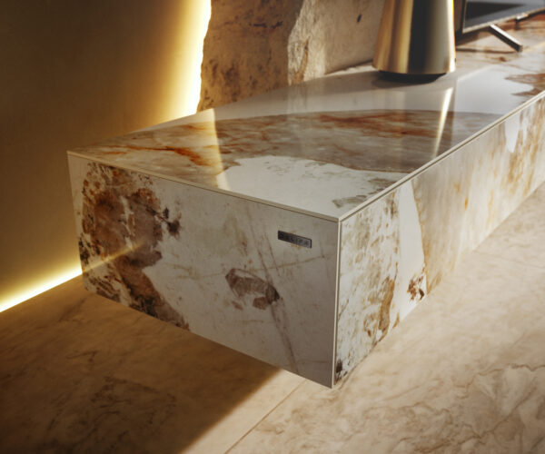 Lágy bézs és fehér árnyalatok egyedi esztétikát kölcsönöznek a CUOR TV szekrénynek, amely mélységgel és intenzitással teli. A hightech kerámia elegáns játékot bont ki, folytonosan harmonikus színátmenetekkel és nemes erezett mintázattal. Kiemeli az ikonikus CUOR design-t – erőteljes, élénk és időtlen kisugárzású. Finom lábak stabil és átlátszó akrilüvegből lebegő megjelenést és elegáns könnyedséget adnak a bútordizájnnak.