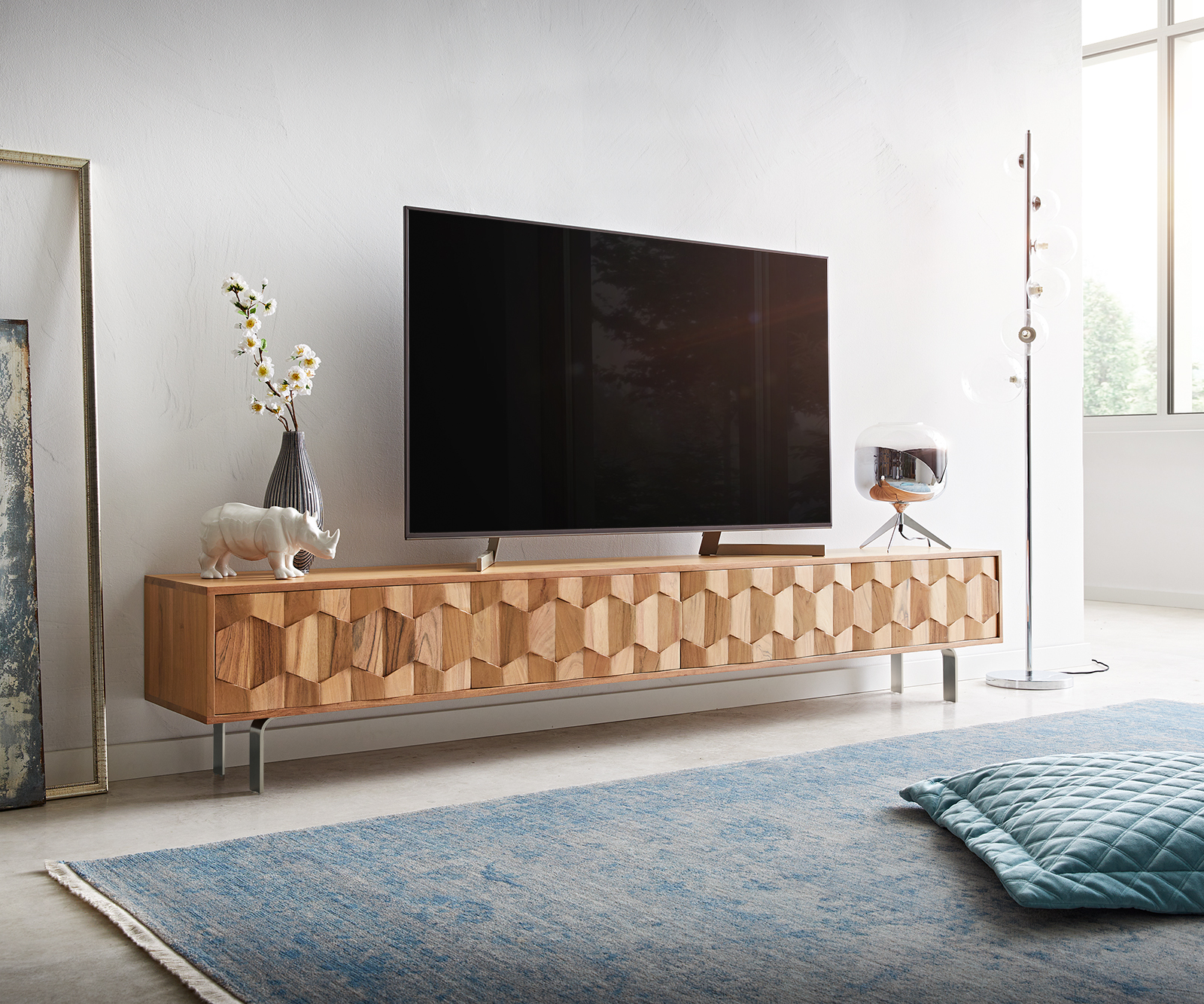 A természetes akácfa meleg árnyalatban ragyog, és egyedi erezetével tűnik ki. A 220 cm hosszú TV szekrény nemcsak a tévé számára kínál helyet, hanem belül 4 ajtó mögött praktikus tárolóhelyet is biztosít.
