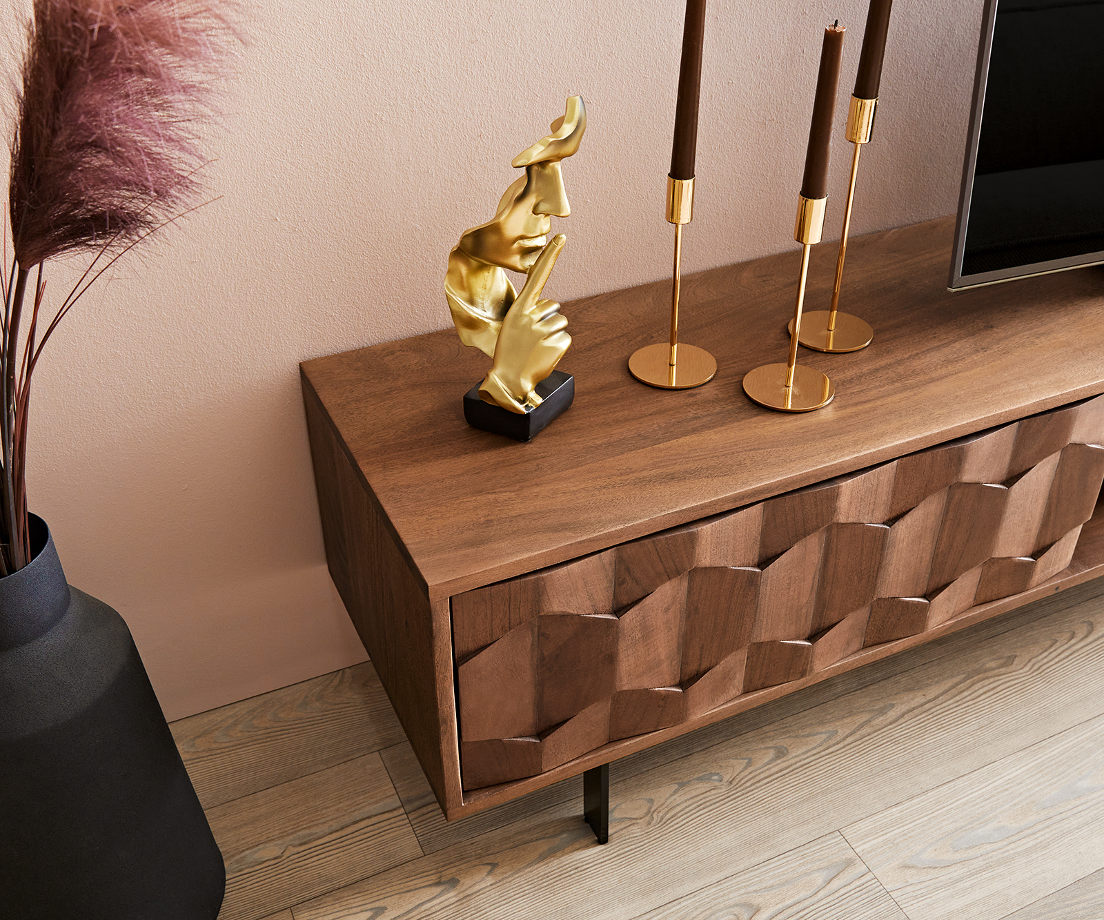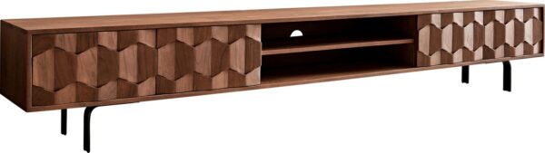 Az akácfa finom erezetével és matt barna árnyalatával nemes hatást kelt. A tágas, 240 cm széles TV szekrény nyitott és zárt tárolóhelyek kombinációjával nyűgöz le.