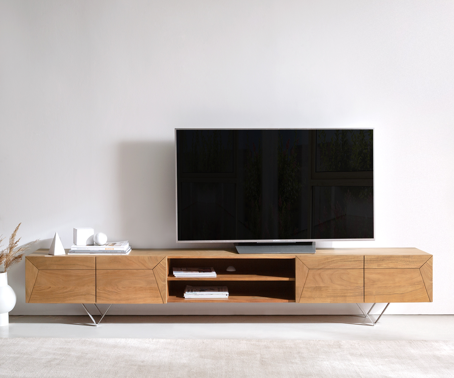 Az esztétikus megjelenés mellett a magas minőségű TV szekrény tágas tárolóhelyével is meggyőz. Nyitott rekeszekben és négy ajtó mögött számos tárgyat rendezett módon tárolhatsz. A széles rakodófelület bőséges helyet kínál a TV készülékednek és dekorációs elrendezéseknek.