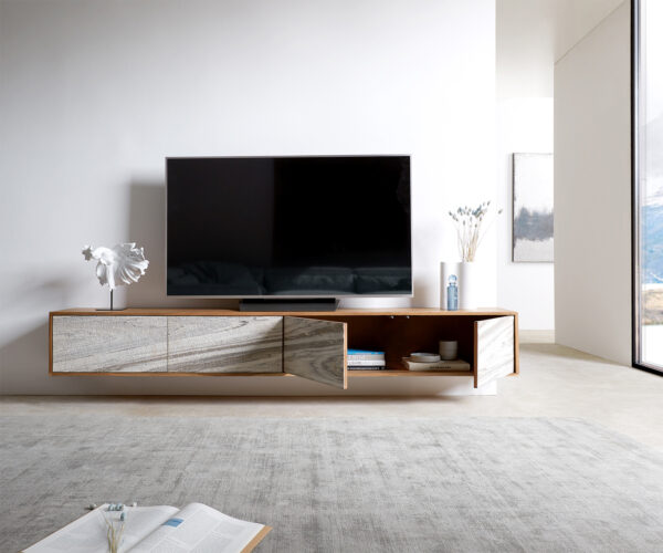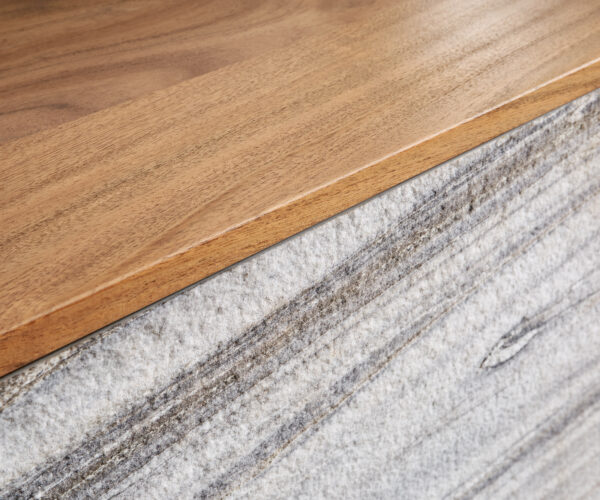 A design kiemelkedő elemei a szekrényajtók, amelyek valódi kő furnérral vannak borítva, mely egyetlen kődarabból készült. A kő lenyűgöző struktúrája tökéletesen illeszkedik a természetes akácfa egyedi erezetéhez, amelyből a korpusz és a bútor rekeszei készülnek. Egy kábelátvezetővel ellátott rakodófelület és bőséges tárolóhely teszi teljessé a dizájnt. Az MDF hordozó „Edge-Banding” élzárással van ellátva, amely masszív fa hatást kelt az összes látható élen.