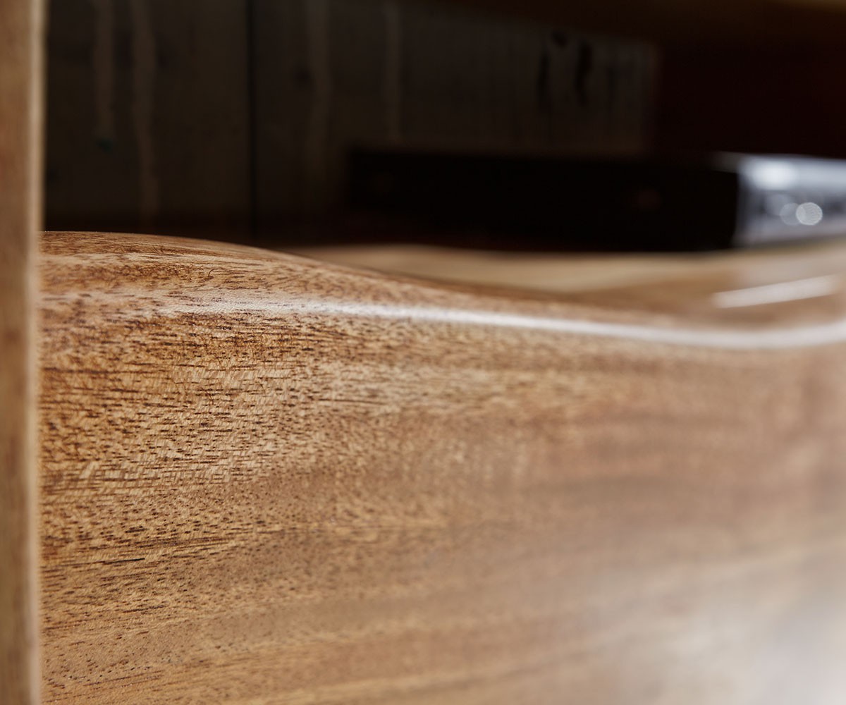A Live-Edge TV szekrény átgondolt kialakítása sokféle tárolási lehetőséget kínál. Négy tágas fiókkal felszerelve a TV szekrény rengeteg helyet biztosít különféle apró tárgyak számára. Két nyitott, hátfal nélküli rekesz található a bútor felső részén. A TV szekrény stabil rakodófelülettel is rendelkezik, ahol a televízió megfelelő helyet kap.