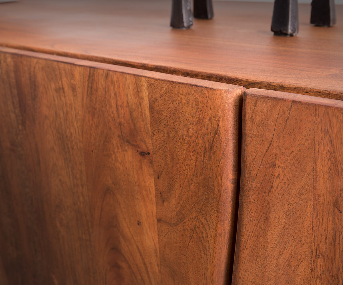 Az elegáns, díszítetlen TV szekrény divatos barna színben kiváló minőségű akácfából készül. A nemes tömörfa különleges keménységéről és dekoratív erezetéről ismert, amely minden darabot egyedivé tesz. Egyedi, természetes hangsúlyt adnak az ajtók is, amelyek egyik oldalon elegáns természetes éllel záródnak.