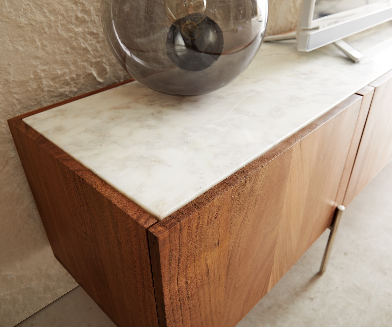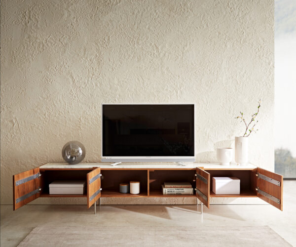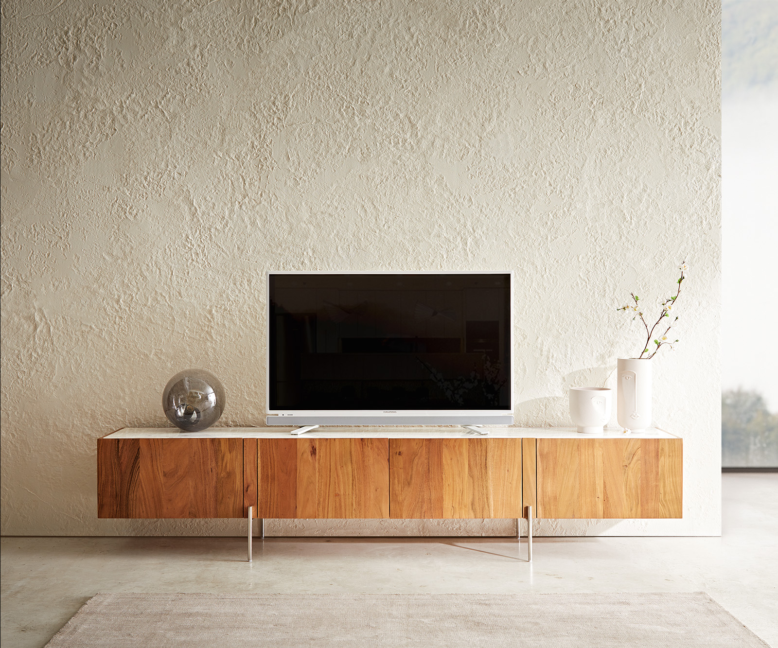 Ezzel a TV szekrénnyel két válogatott természetes anyag egyesül egy kontrasztos és lenyűgözően élénk összképben. Meleg vörösbarna akácfa keretbe foglalva a fehér márvány érintetlen szépsége egyedülálló módon tárul fel. Részletgazdag mintázatok jellemzik a természetes fát és követ, melyek minden darabon egyedi karaktert mutatnak, így ez a bútor egy különleges egyedi darab, amely minden berendezési trendet túlél.