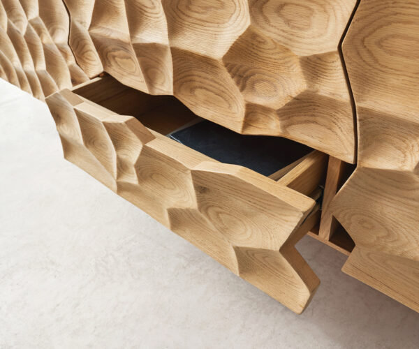 A tágas Solu TV szekrény lenyűgöz egyedi kialakításával, amelyet a levelek elegáns sejtszerkezete ihletett. Fenntartható erdőgazdálkodásból származó értékes tölgyfából készült, a finoman megmunkált korpusz minden tekintetet az impozáns 3D-előlapra irányít. Az előlap mintázata egy bonyolult precíziós marás segítségével az egész felületet átfogja. A TV szekrény ajtói és fiókjai tökéletesen illeszkednek a mintázathoz, így nem keletkeznek zavaró megszakítások. A 3D-optika különleges mélységét különösen erős anyag használata biztosítja, amelyet gondosan válogattak ki a gyártási folyamat előtt.