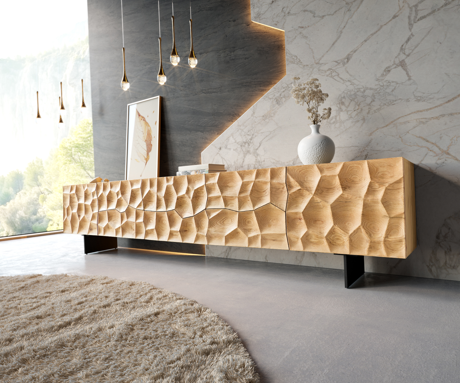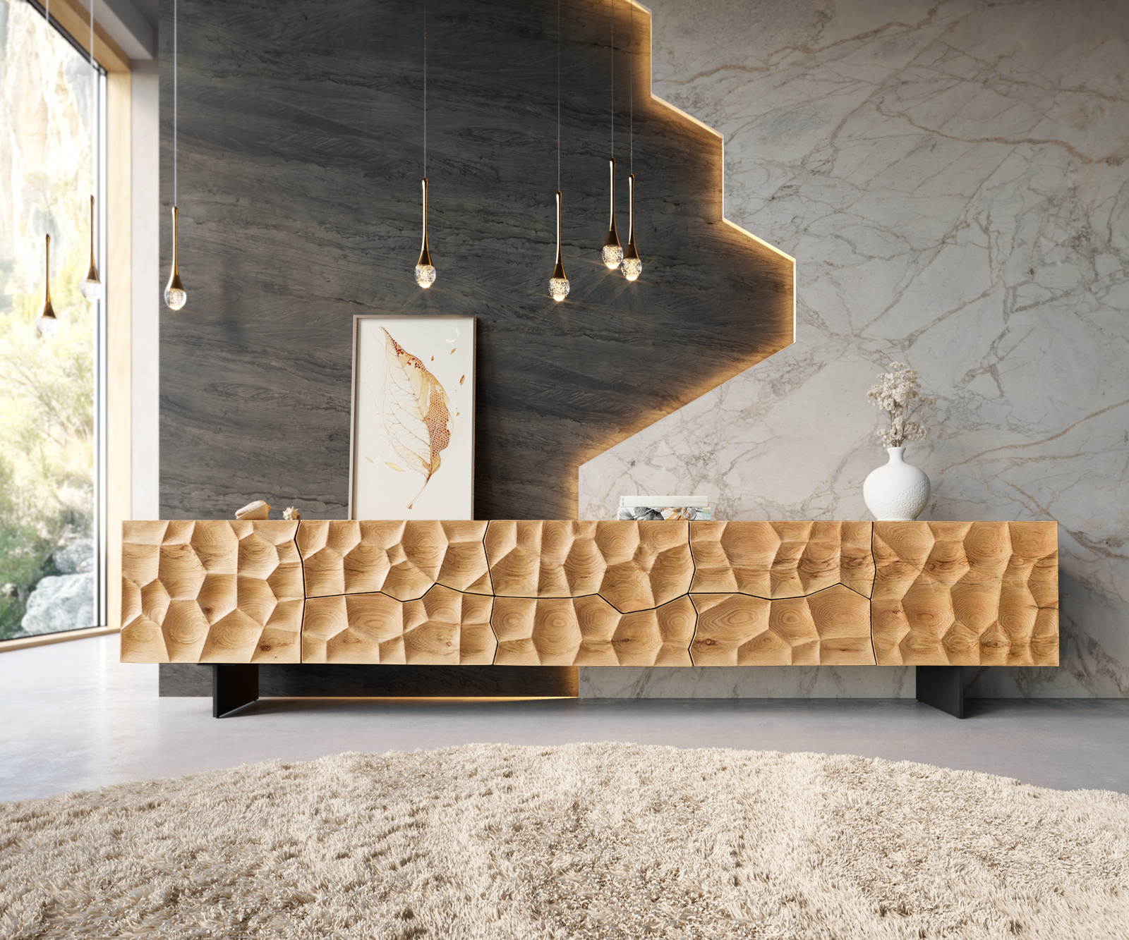 A Solu TV szekrény egyedülálló faipari remekmű, amely fenntartható erdőgazdálkodásból származó értékes tölgyfából készült. Egy finom, visszafogott korpusz helyezi a középpontba a lenyűgöző 3D előlapot. A domborítás kidolgozása igényes munkát igényel. Gondosan válogatott, különösen erős faanyagot precízen marunk végig az egész felületen, és egy egyedi mintával látjuk el, amely a levélsejtek elegáns szerkezetére emlékeztet. Közben a két ajtó és a négy fiók pontosan igazodik a domborításhoz, így nem keletkeznek zavaró megszakítások, és az előlap teljes szépségében megmarad.