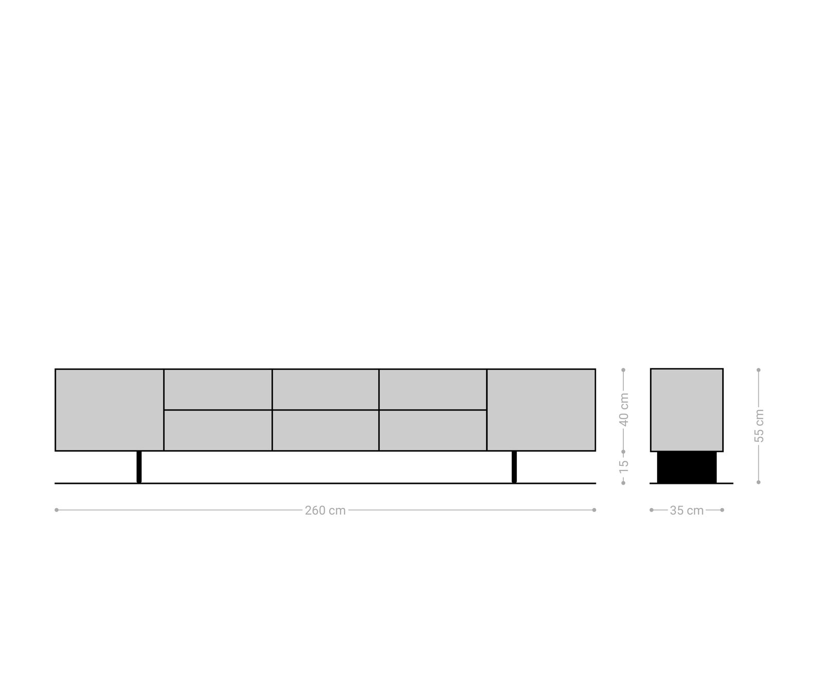 TV szekrény Solu 260 cm tölgy természetes 2 ajtós 6 fiókos lebegő fém láb fekete 3D előlap