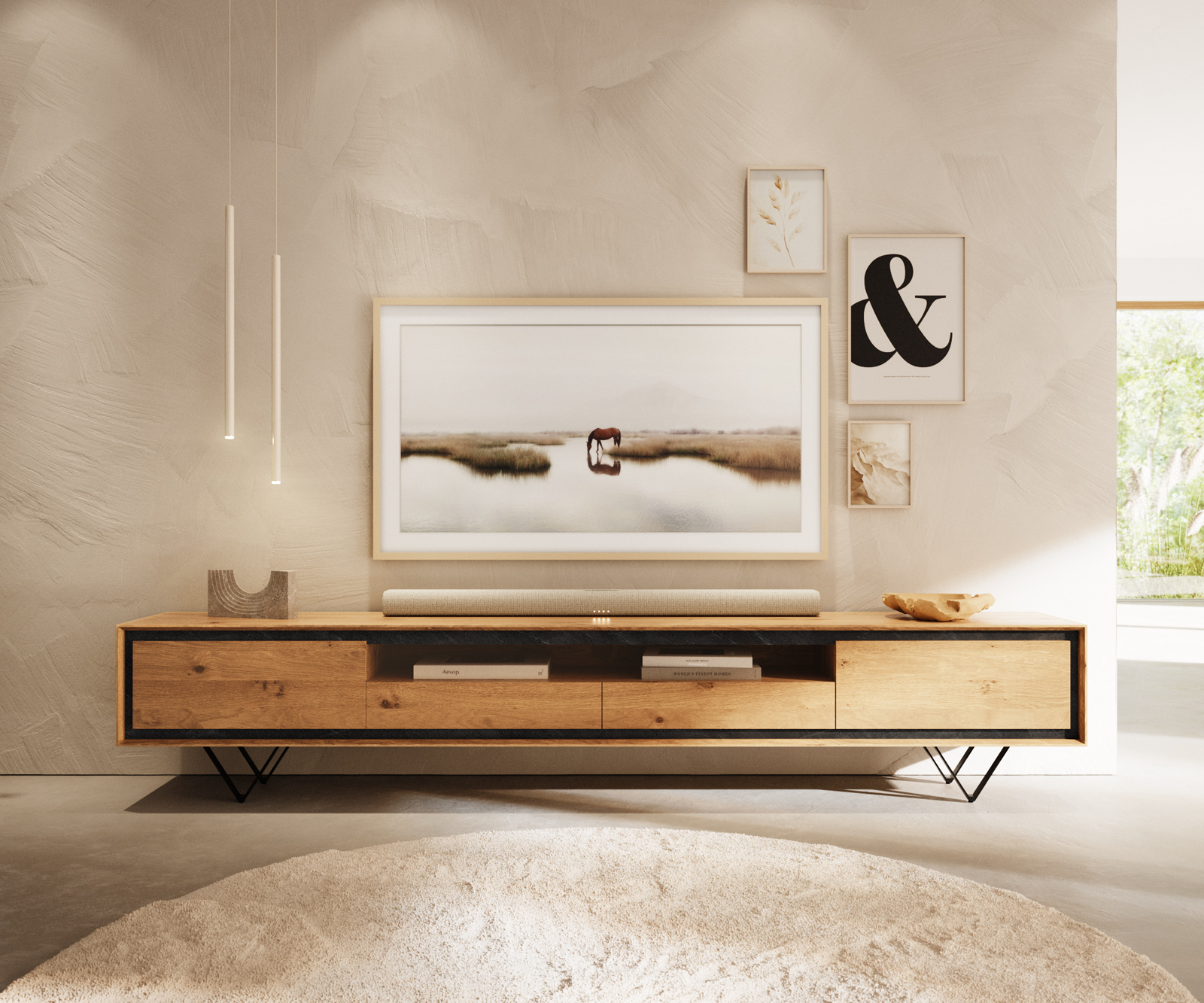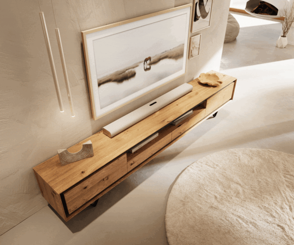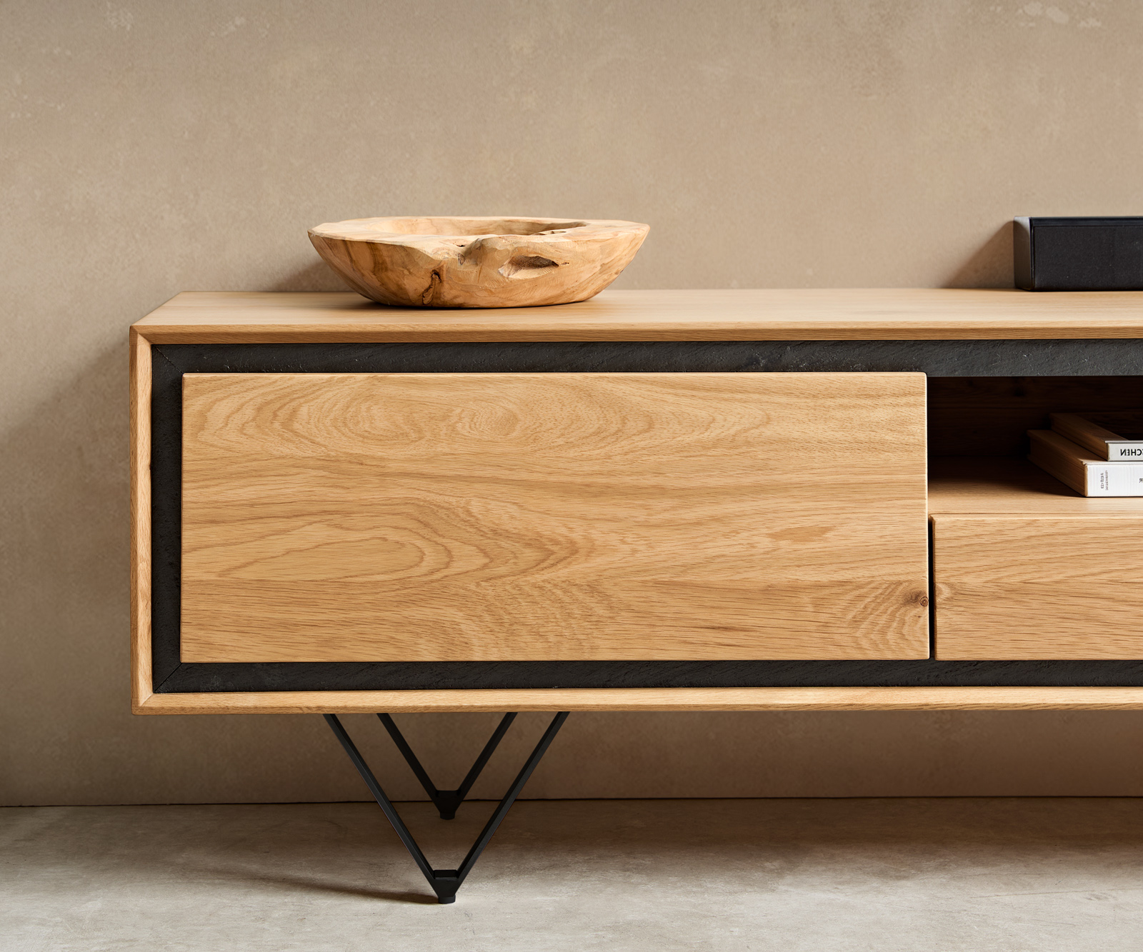 A fekete, fém V-láb stabilitást kölcsönöz a TV szekrénynek, és modern, ipari megjelenést biztosít. A kiváló minőségű anyagok és a átgondolt funkcionalitás kombinációja időtálló kiemelkedő darabbá teszi ezt a bútort otthonodban.