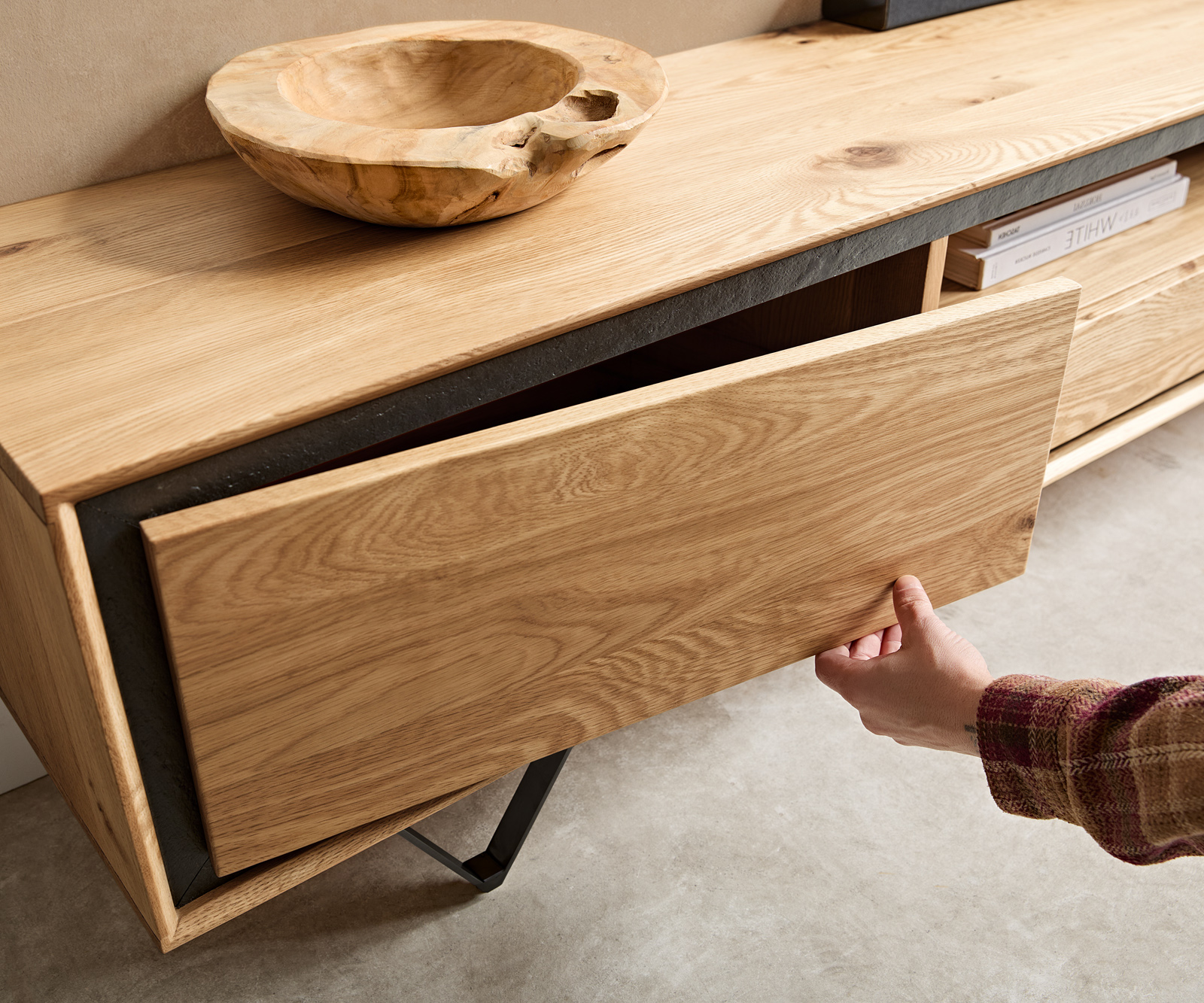Adj elegáns és egyben modern hangulatot a nappalidnak a Stonegrace sorozat TV szekrénye segítségével. A kiváló minőségű tölgyfa tökéletes harmóniában áll a sötét kőfurnérral, így nemes, kontrasztos dizájnt teremt. Két ajtóval, két fiókkal és egy nyitott rekesszel a TV szekrény ideális arra, hogy médiaeszközeidet stílusosan és áttekinthetően rendezd el.