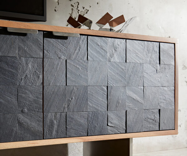 A különböző, karakteres anyagok ízléses kombinációja teszi a Teele sorozat nemes TV szekrényét vonzó látvánnyá a nappaliban. Itt egy kiváló minőségben megmunkált masszív fa korpusz találkozik dekoratív pala mozaikapplikációkkal és egy robusztus, fényes rozsdamentes acél lábazattal. A különböző színek vonzó módon emelik ki az egyes anyagok egyedi különbségeit.