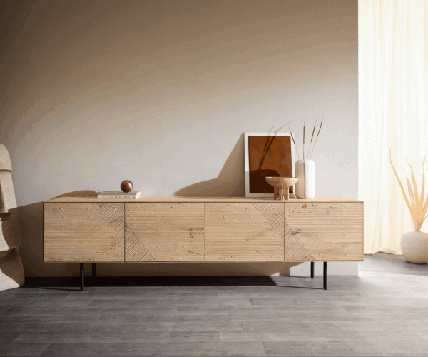 A Tereos TV szekrény nemes természetes tölgyből modern dizájnt ötvöz kivételes részletekkel. Különösen feltűnőek a 3D maratott előlapok, amelyek exkluzív hangulatot kölcsönöznek minden nappalinak. Négy ajtó mögött tágas tárolóhely található, amely a Soft-Close és Push-to-Open vasalatoknak köszönhetően különösen kényelmesen használható. A beépített kábelátvezetés rendet tart. A fekete fém kerek lábak stílusos hangsúlyokat adnak, és korszerű eleganciát biztosítanak.