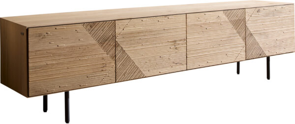A TV szekrény Tereos természetes tölgyből valódi látványosság az otthonodban. Művészien maratott 3D előlapjaival lenyűgöz, amelyek egyedi fény- és árnyjátékokat hoznak létre, és páratlan karizmát kölcsönöznek otthonodnak. Négy ajtó mögött tágas tárolóhely rejtőzik, amely kiváló minőségű soft-close és push-to-open vasalatokkal van felszerelve a legmagasabb kényelem érdekében. Az integrált kábelátvezetés mindig rendet biztosít, míg az átlátszó akril lábak lenyűgöző lebegő hatást keltenek.