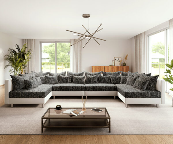 XL „U” alakú kanapé Clovis a DELIFE azonos nevű modulrendszerével készült. A műanyagból készült kerek lábakon álló kárpitozott bútor lenyűgöző formatervezésével és kifinomult színvilágával egyaránt meggyőző. Minden ülőhely ezen a design kanapén kényelmes mélységgel és lenyűgöző komforttal bír, amelyet formastabil habkárpitozás és bonell rugós szerkezet biztosít. A kanapé strapabíró, fekete színű strukturált szövettel van bevonva.