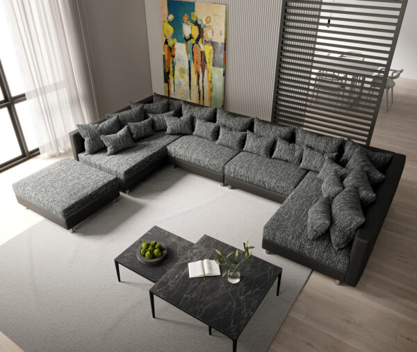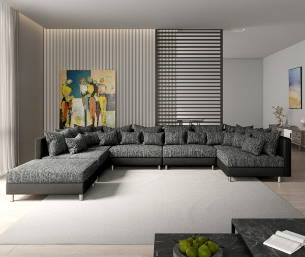 XL „U” alakú kanapé Clovis a DELIFE azonos nevű modulrendszerével készült. A műanyagból készült kerek lábakon nyugvó kárpitozott bútor lenyűgöző formatervezésével és kifinomult színvilágával egyaránt meggyőz. Minden ülőhely ebben a design kanapéban kényelmes mélységgel és lenyűgöző komforttal rendelkezik, amelyet formastabil habkárpitozás és bonell rugós szerkezet biztosít. A kanapé fekete színű, könnyen tisztítható műbőr és strapabíró strukturált szövet borítással készült.